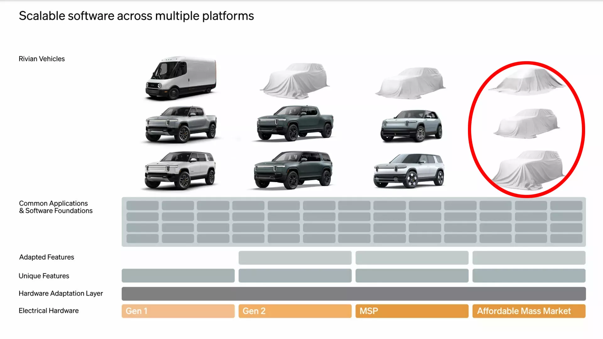ريفـيان لمّحت سابقًا خلال يوم المستثمرين لعام 2024 إلى نيتها إطلاق ثلاث سيارات كهربائية جديدة موجهة للسوق الواسع بعد R2 وR3. ورغم أن تصاميمها ظلت مغطاة آنذاك، إلا أنها ستعتمد على نفس البنية الكهربائية والبرمجيات الخاصة بـ Rivian، إضافة إلى التعاون مع فولكس فاجن في هذا المجال.
