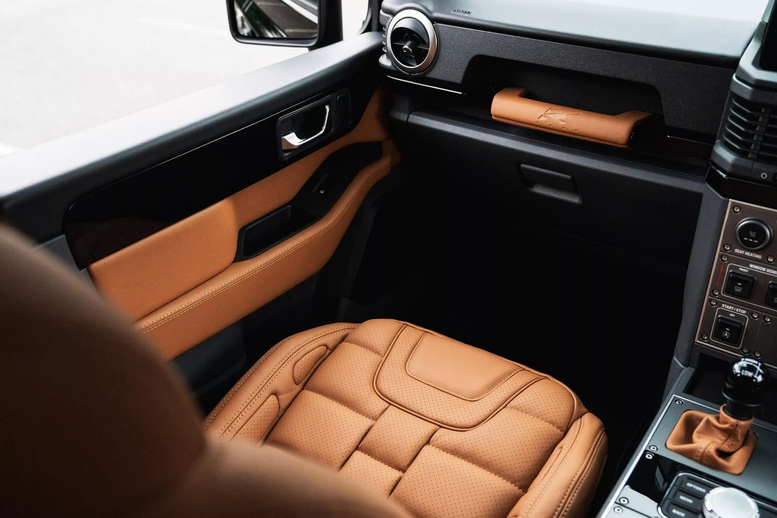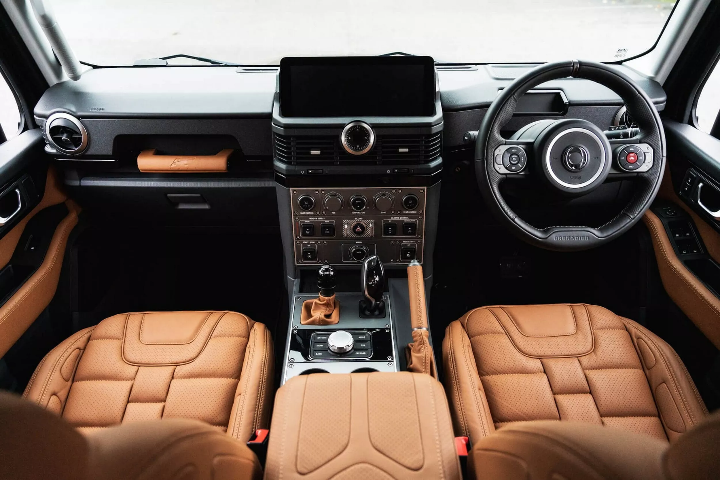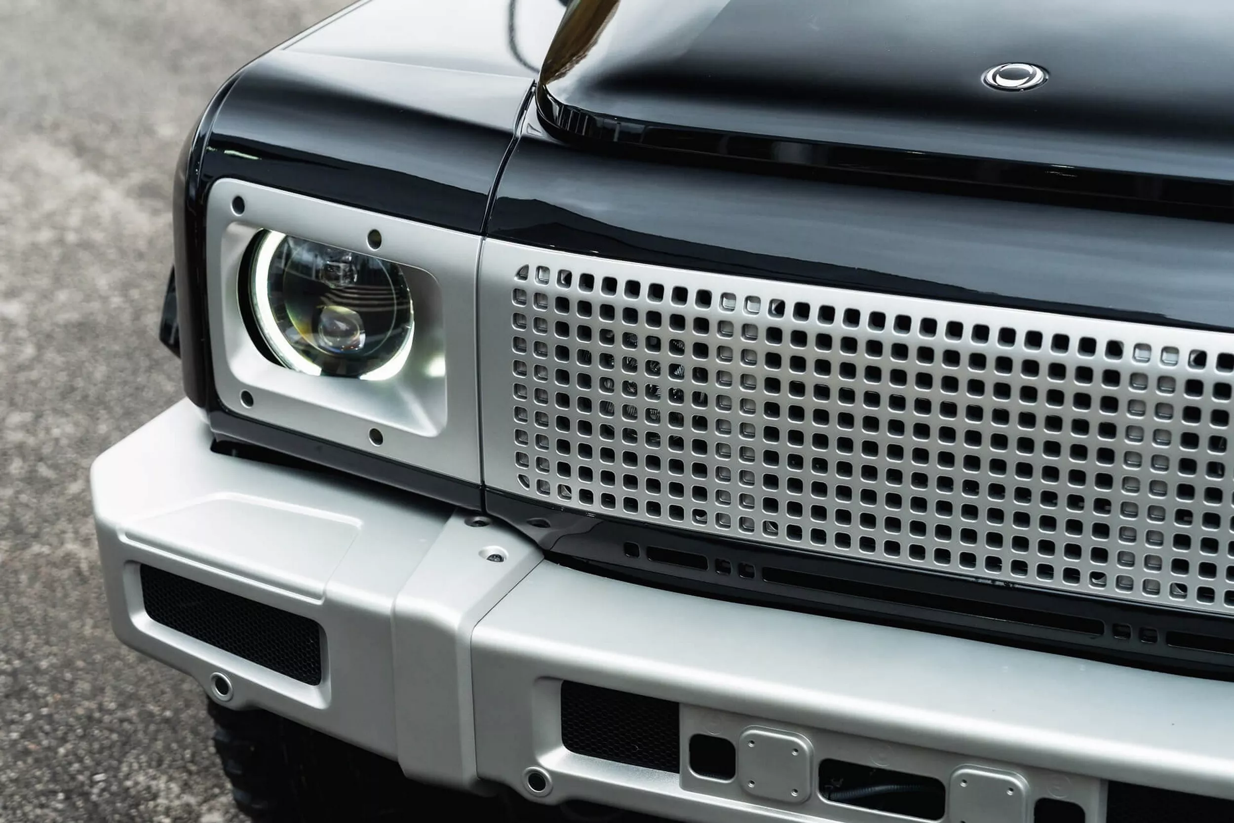 تعتمد هذه النسخة على فئة Fieldmaster Edition من جرينادير، وتأتي بلون Inky Black مع لمسات Volcanic Satin Silver على الشبك الأمامي والصدامات والمفصلات والجنوط. أما المقصورة فتم كسوتها بجلد Old English Tan مع تطريزات وتفاصيل مثقبة تعزز الطابع الفاخر الكلاسيكي.