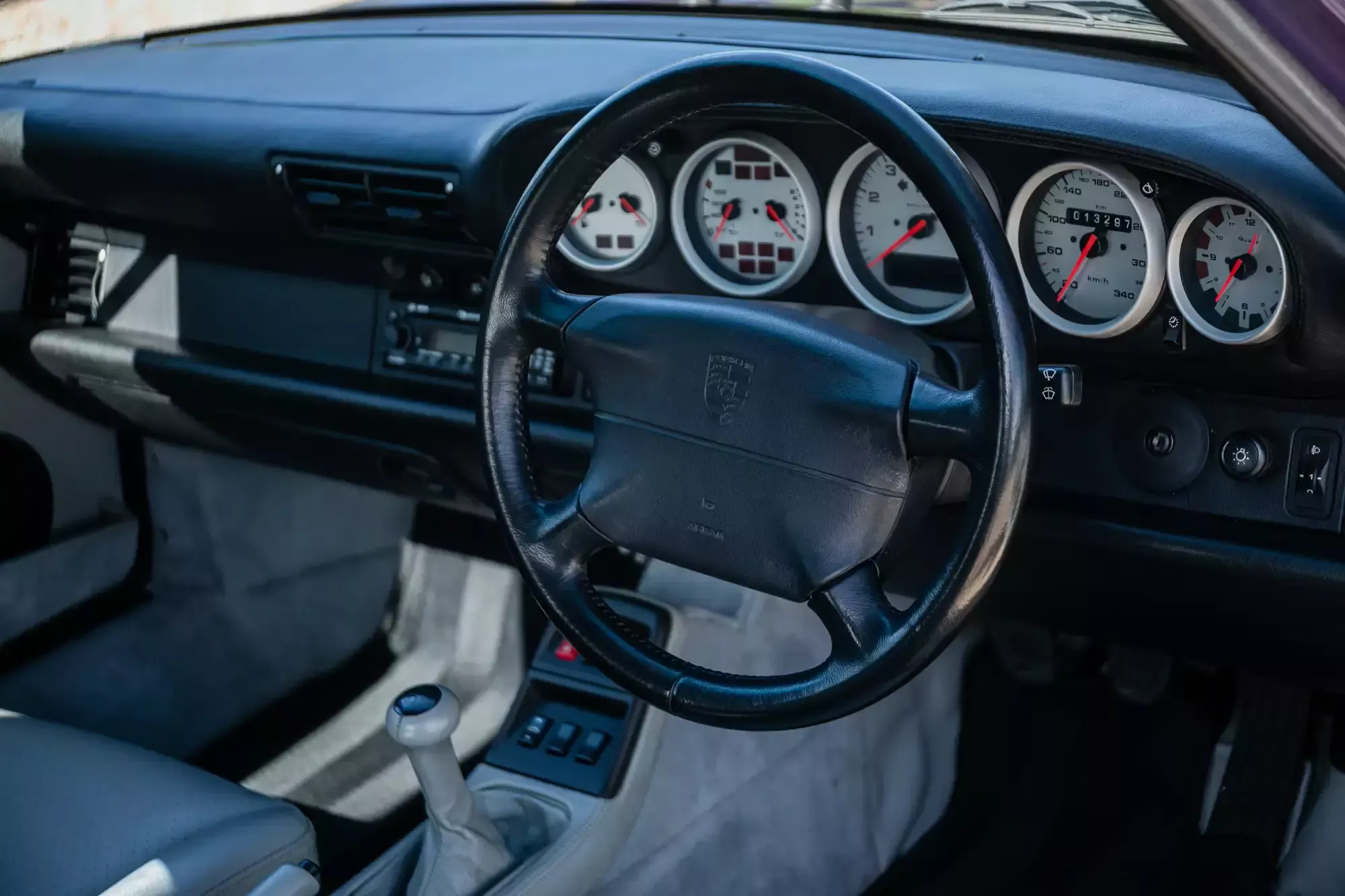 تتميز هذه التحفة بلون Amaranth Violet النادر، وعدادها لا يُظهر سوى 8,262 ميلاً (13,297 كم) منذ مغادرتها مصنع بورشه عام 1995، ما يجعلها عملياً بحالة شبه جديدة.
