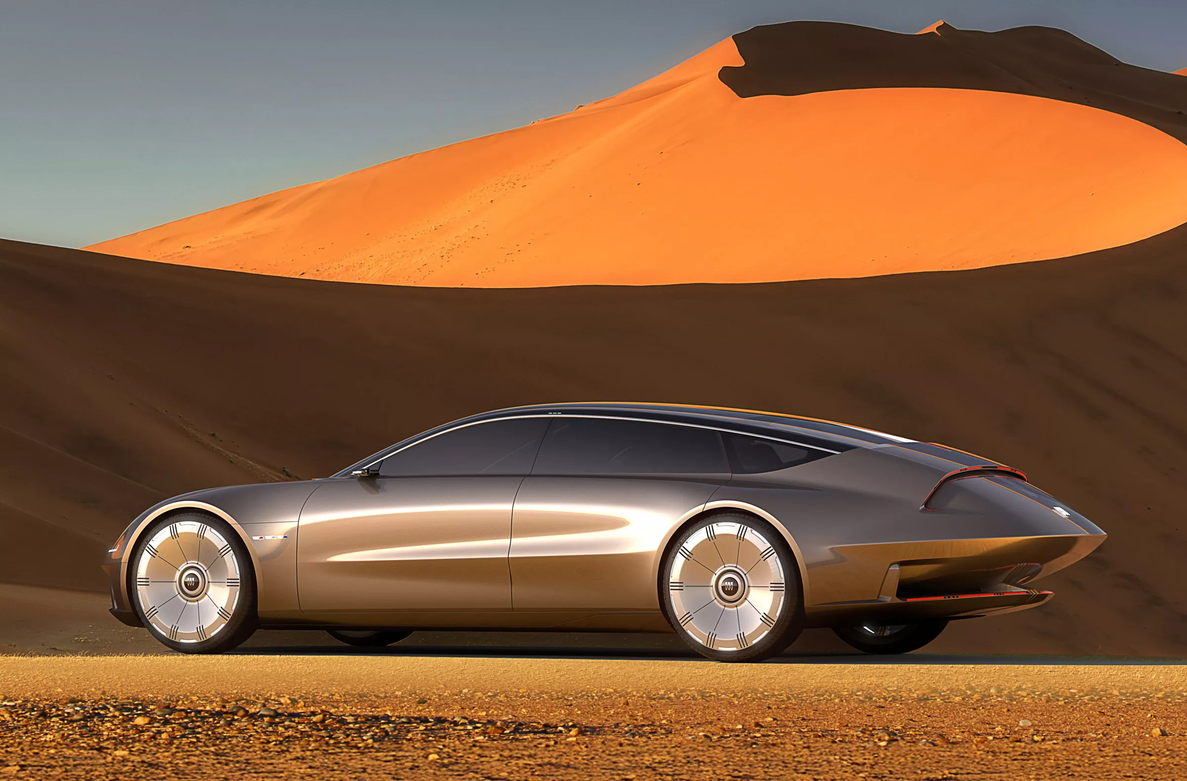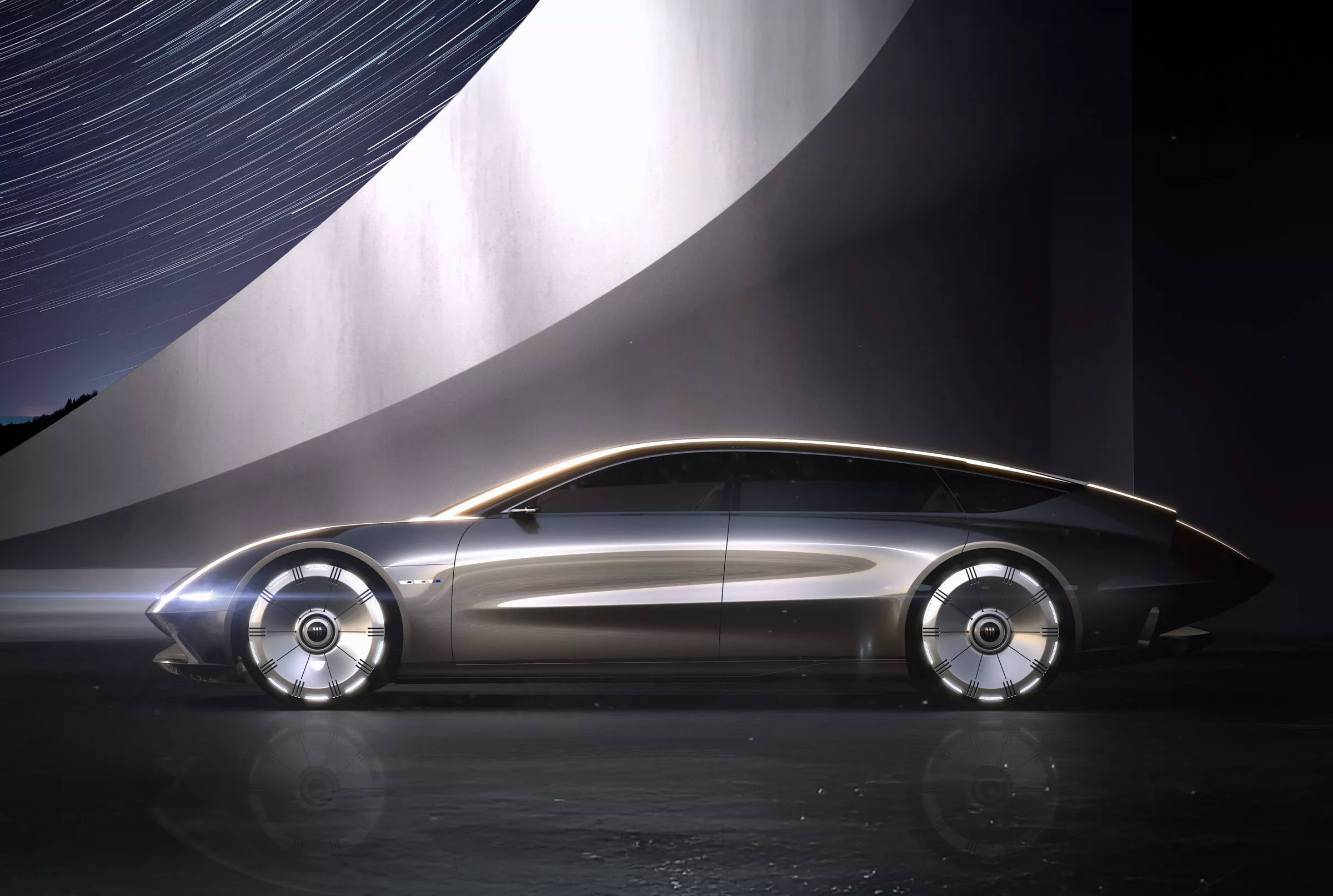 السيارة الجديدة تأتي بخطوط انسيابية ومظهر كوبيه طويل منخفض بأربعة أبواب “مقصّية” (Scissor Doors)، ما يمنحها طابعًا ديناميكيًا مشابهًا لسيارات السباق الفضائي التي ميّزت فترة الخمسينيات. الغطاء الأمامي الرفيع والمؤخرة الممتدة بتصميم “القارب الكلاسيكي” تعززان الطابع الفاخر للنموذج.