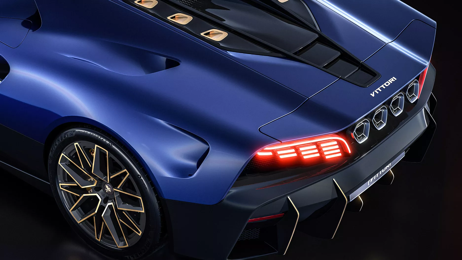 من الخارج، تتّسم السيارة بخطوط انسيابية عدوانية مستوحاة من سيارات بوغاتي ولامبورغيني وماكلارين، مع مقدمة منخفضة وشبك أمامي صغير يذكّر بهوية بوغاتي، وفتحات هواء ضخمة لتعزيز الأداء الهوائي. الجزء الخلفي لا يقل درامية، إذ يضم أربعة مخارج عادم بتصميم فريد وجناحاً متحركاً يضفي لمسة أداء عالية على المظهر العام.