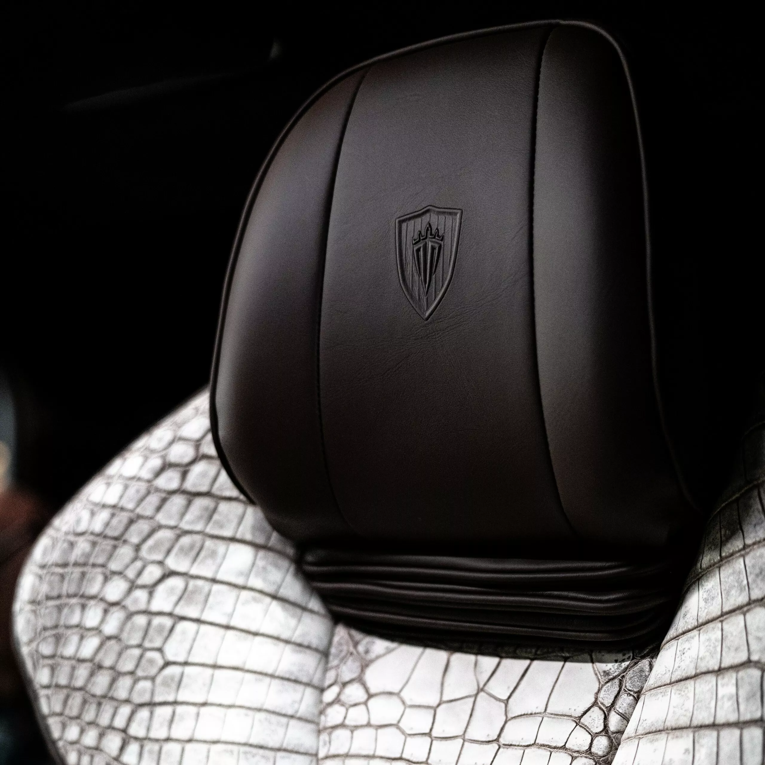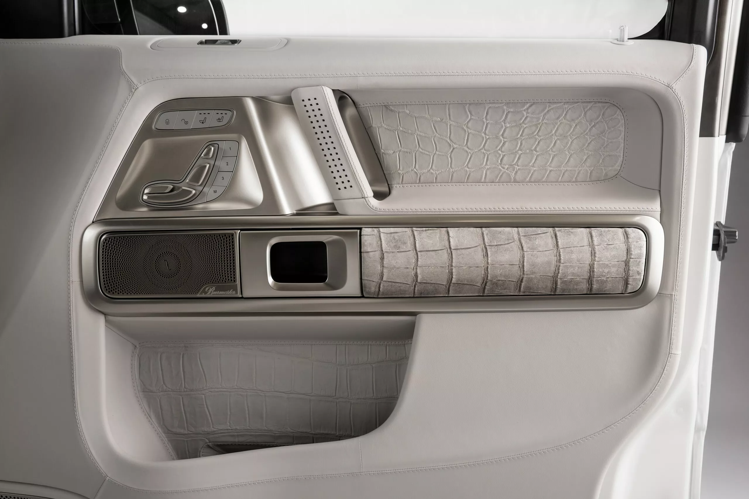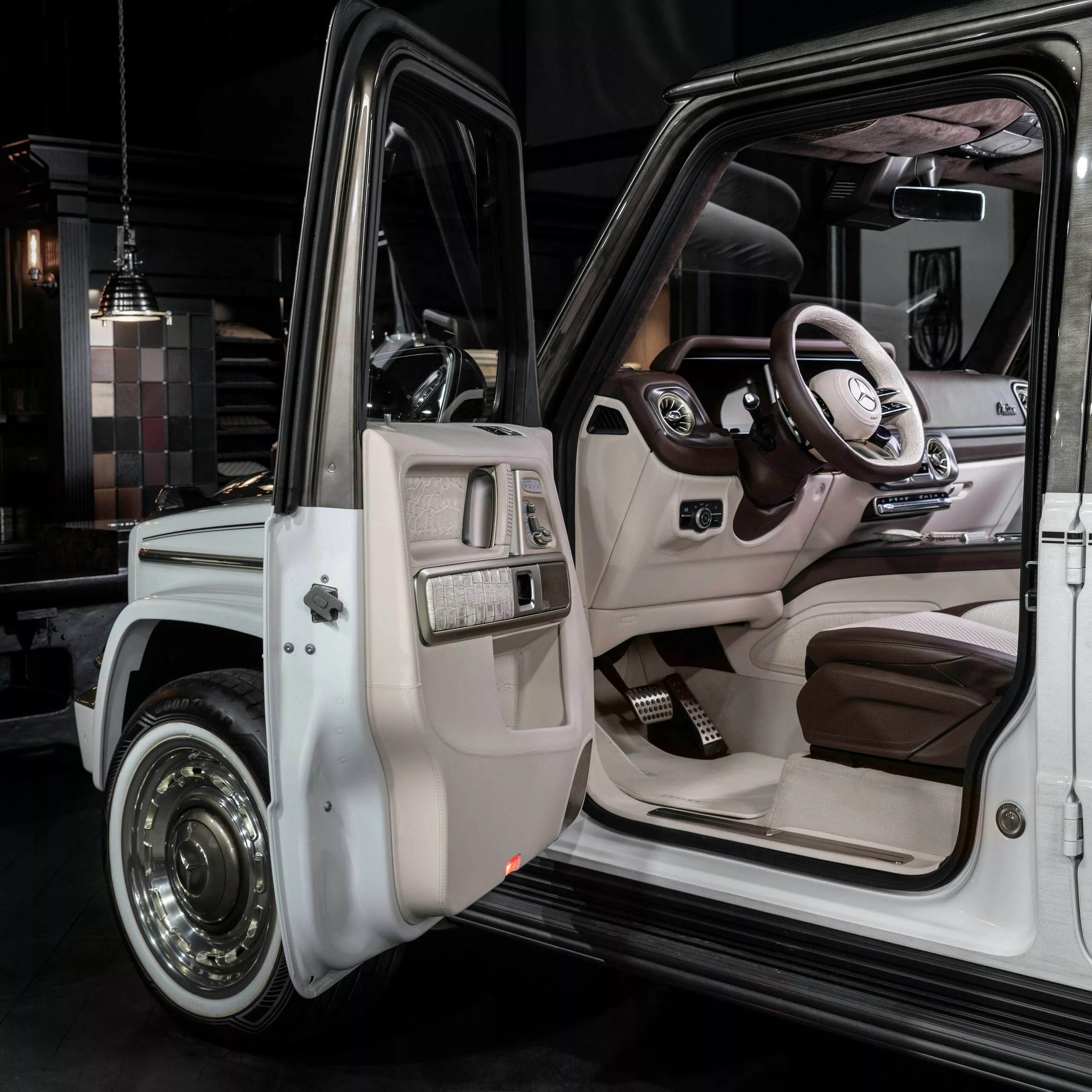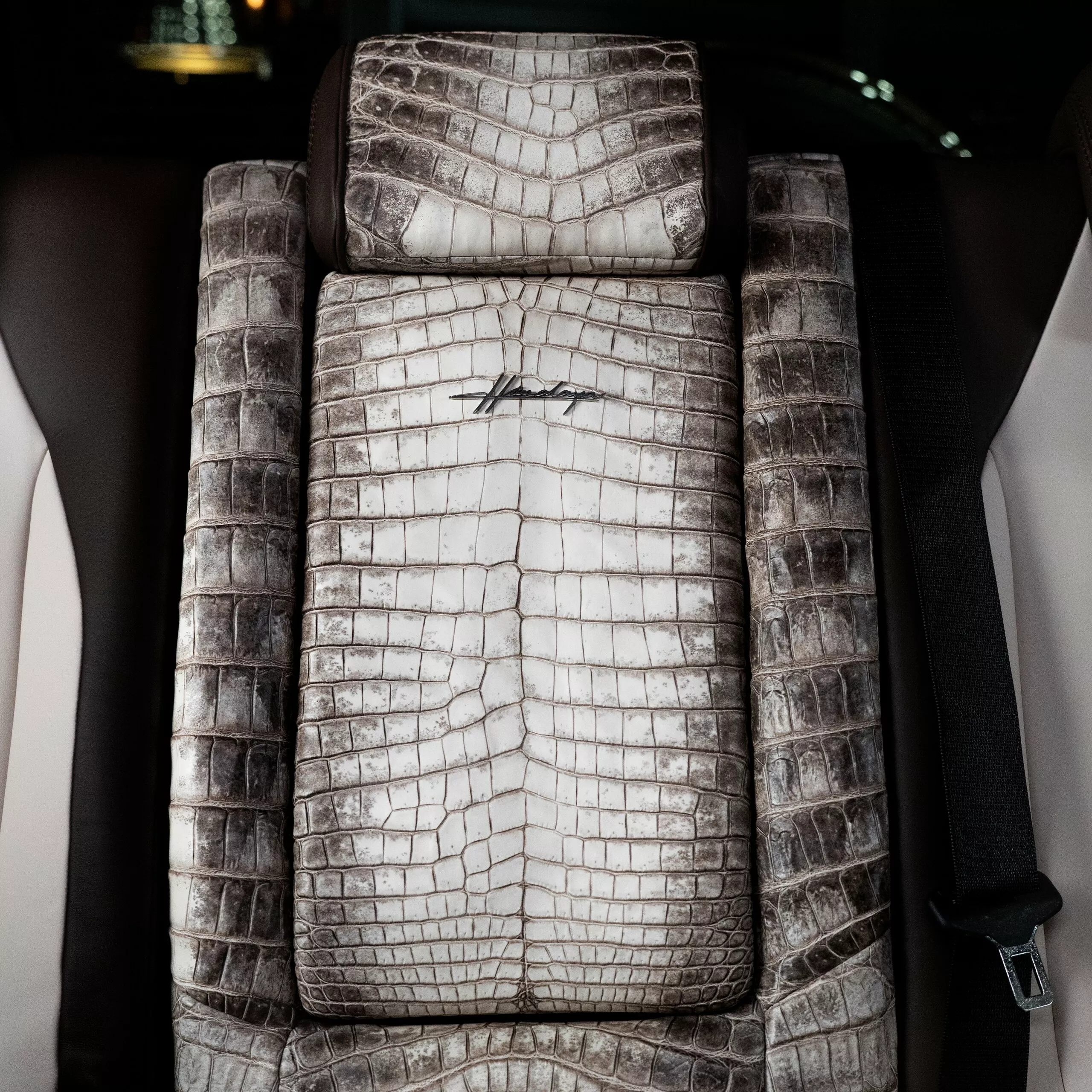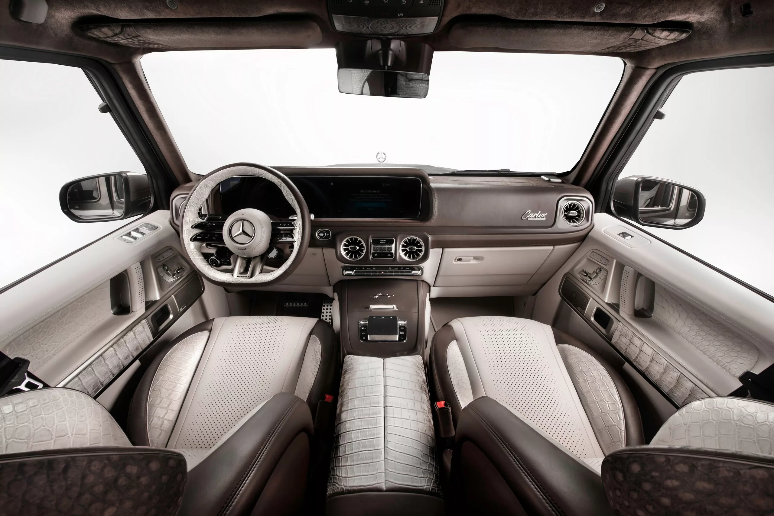 الداخلية في G63 Himalaya هي عالم من الفخامة المفرطة. فقد استخدمت Carlex جلد تمساح “هيمالايا” النادر المعروف من حقائب Hermès Birkin الشهيرة، لتغطية المقاعد الأمامية والوسطى. ويُعد هذا الجلد من أفخم المواد في العالم نظرًا لندرته وسعره الباهظ الذي قد يتجاوز عشرات الآلاف من الدولارات للمتر الواحد.