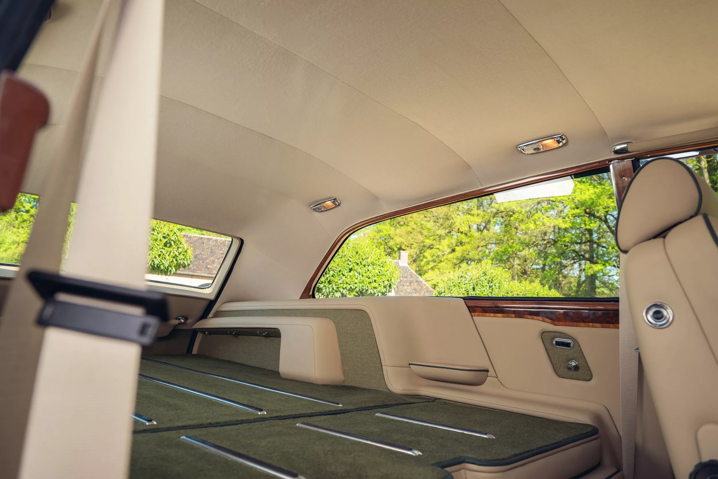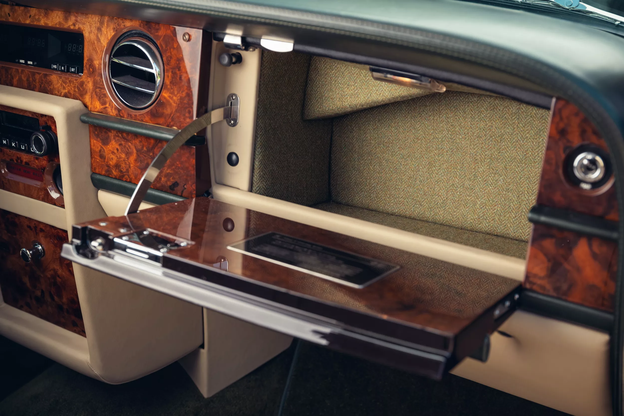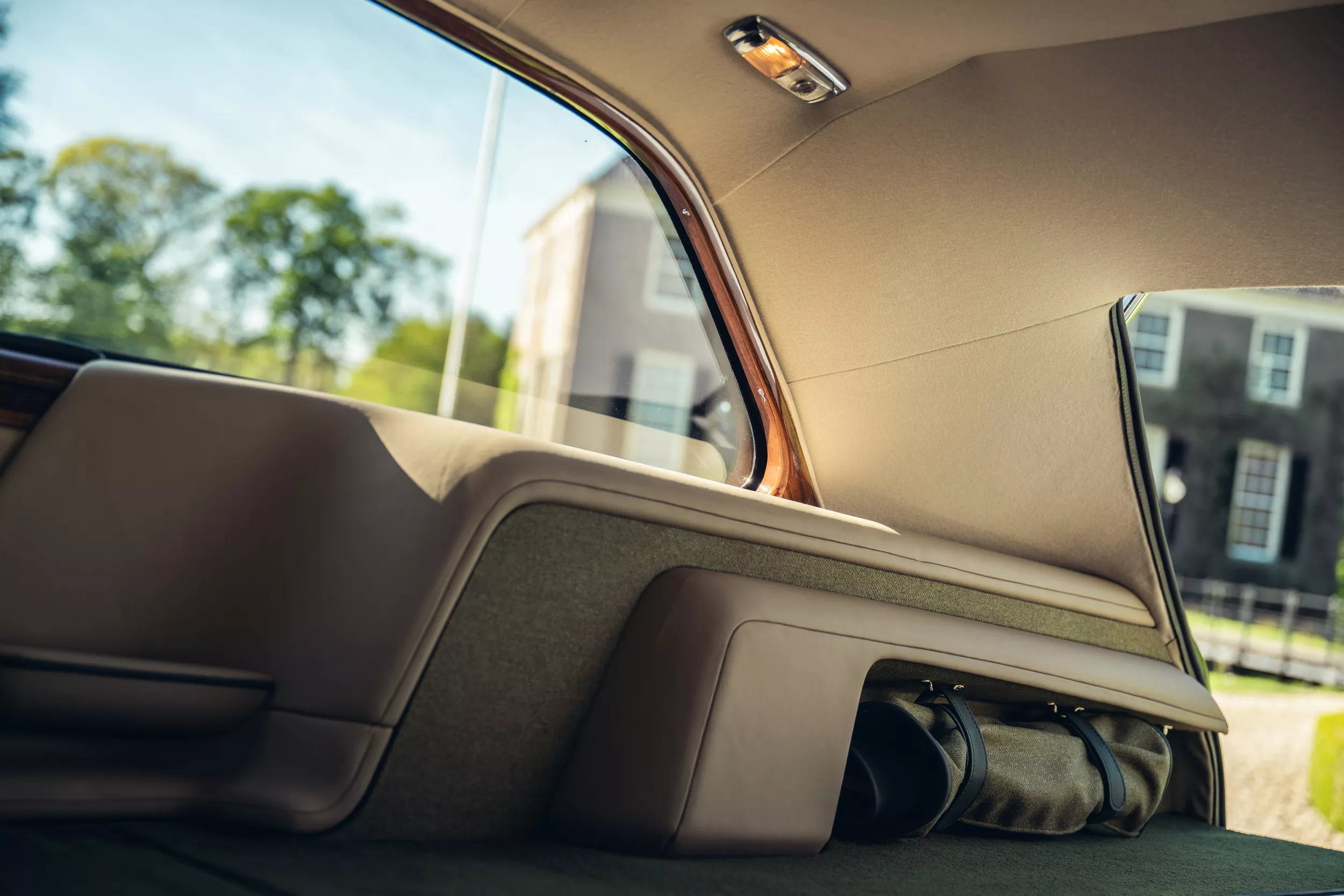 في الداخل، تم ترميم الخشب الأصلي بلوحة القيادة الفاخرة، مع جلد بيج فاخر ولمسات خضراء وزرقة ناعمة. تشمل الإضافات الفريدة عداد سباقات Rally Meter من نوع Brantz مخفي خلف لوحة خشبية، وجيب خرائط، ومصباح قراءة، ومجموعة حقائب مطابقة للتصميم الداخلي. كما أضيفت مرايا تجميل على الباب الخلفي ومجموعة تنظيف للدراجات — لمسات تعكس الدقة البريطانية في أبهى صورها.