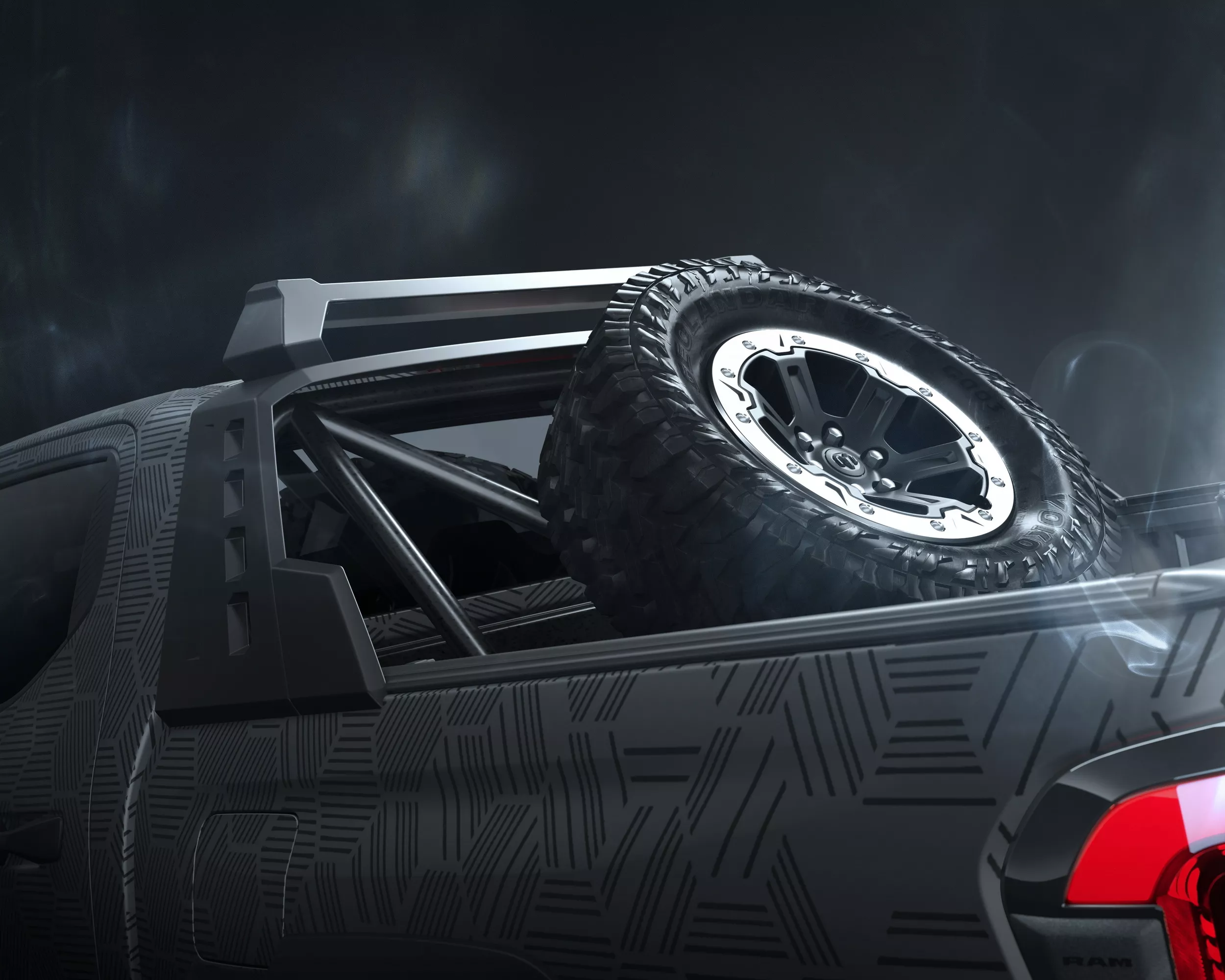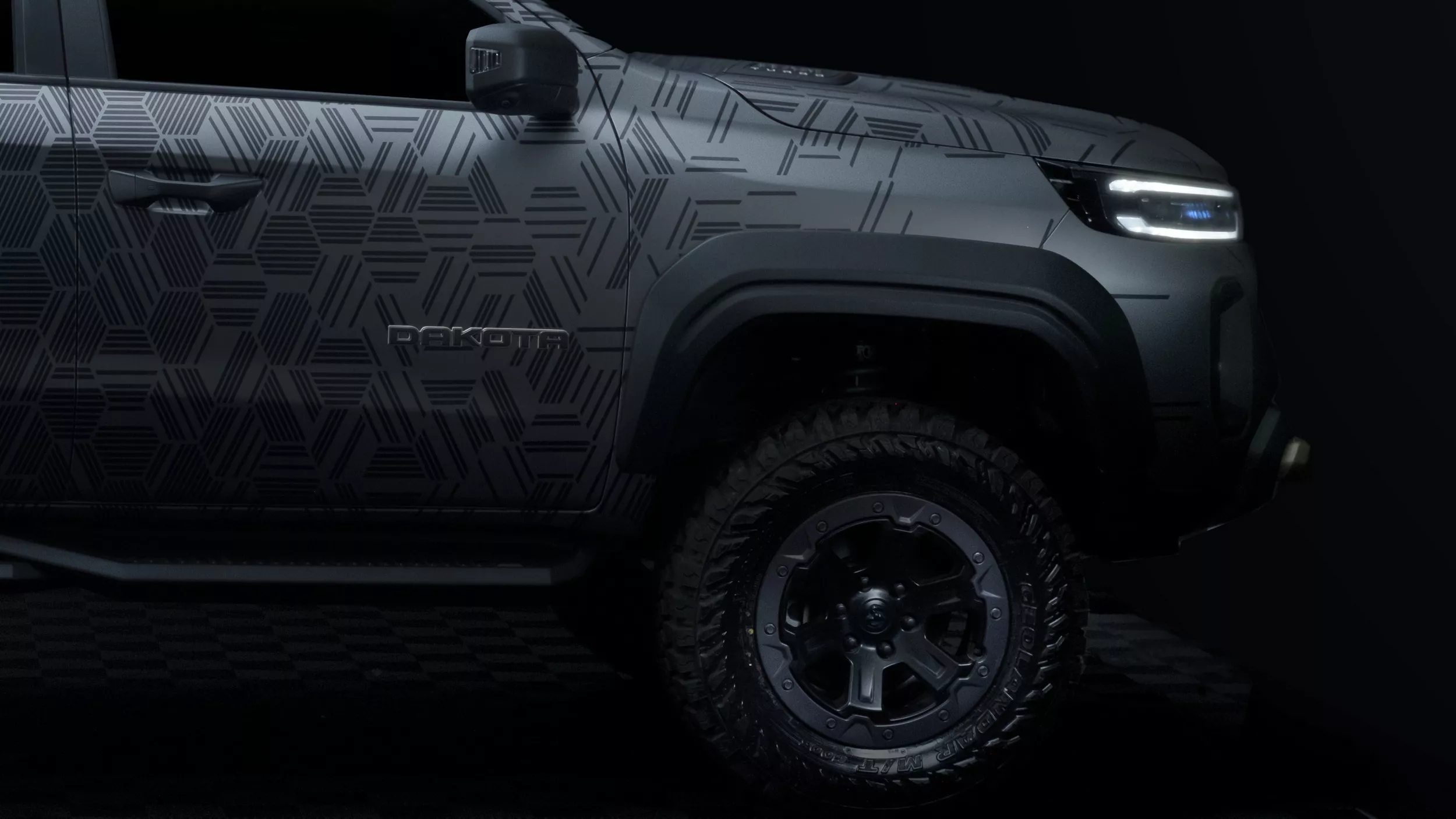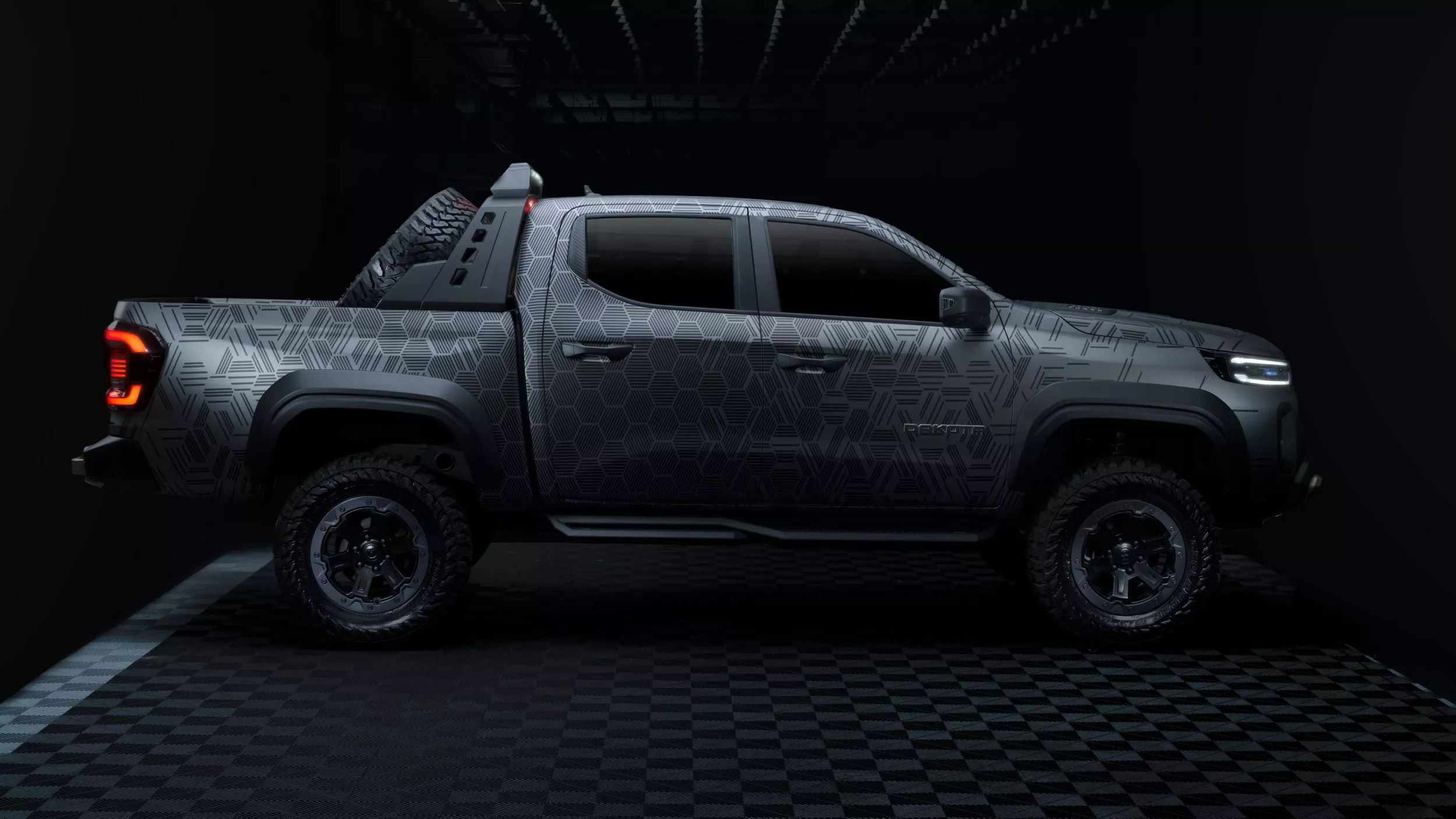 يحمل مفهوم Dakota Nightfall عجلات Beadlock مقاس 18 إنش بإطارات All-Terrain قياس 33 إنش، مع نظام تعليق مرفوع ومساعدات Fox. كما زُودت البيك أب بخطافات سحب، ونش كهربائي، ودرج جانبي، وقضيب رياضي مزوّد بإضاءة LED يحمل إطاراً احتياطياً بالحجم الكامل. كما يضيف اللون الخارجي المطفي مع لمسات برونزية مظهراً مغامراً مميزاً.