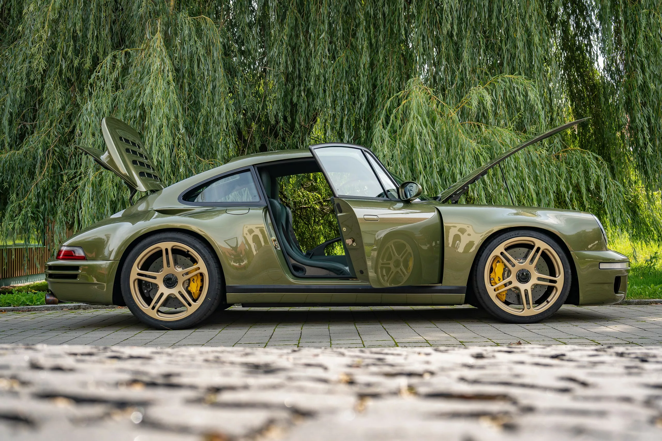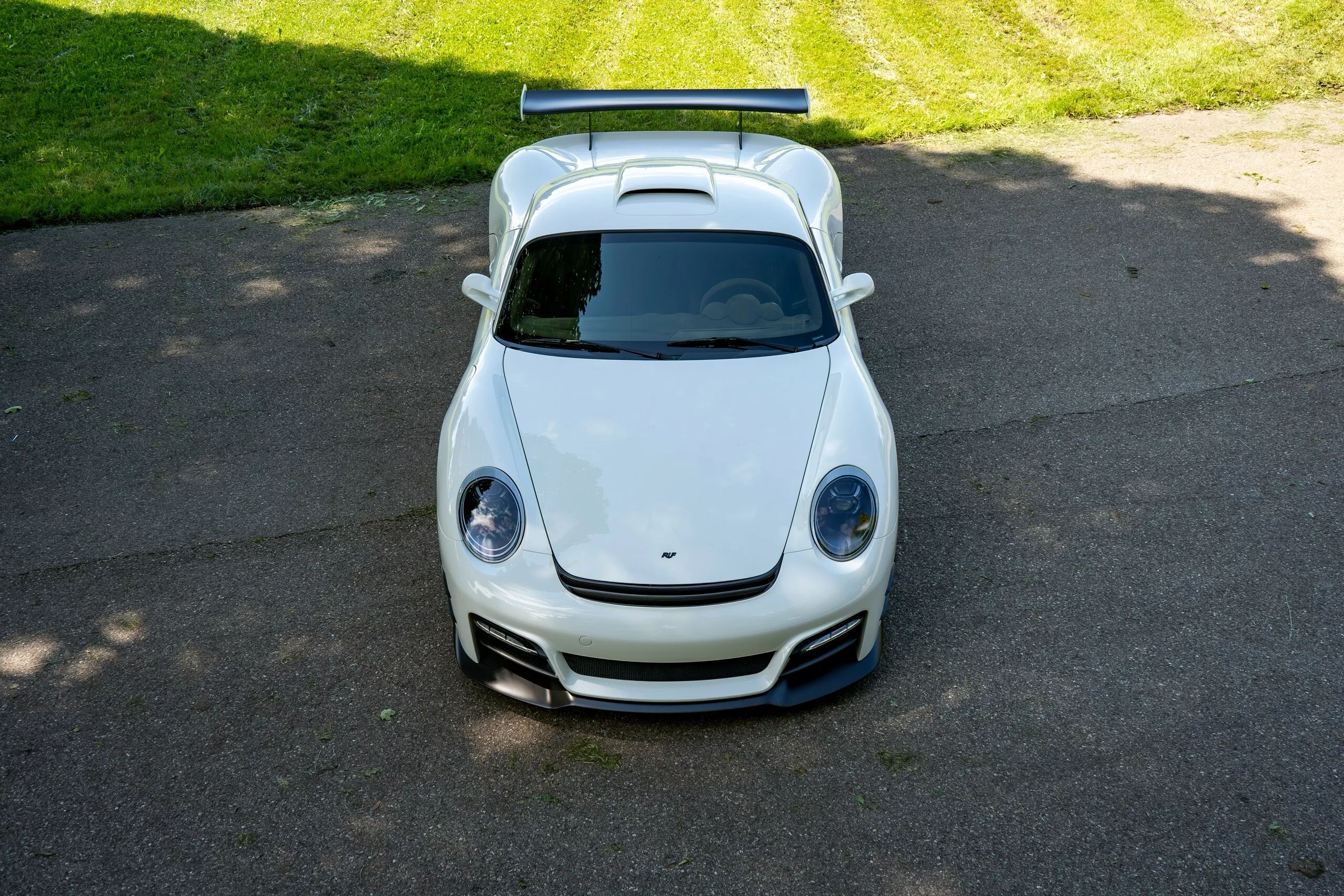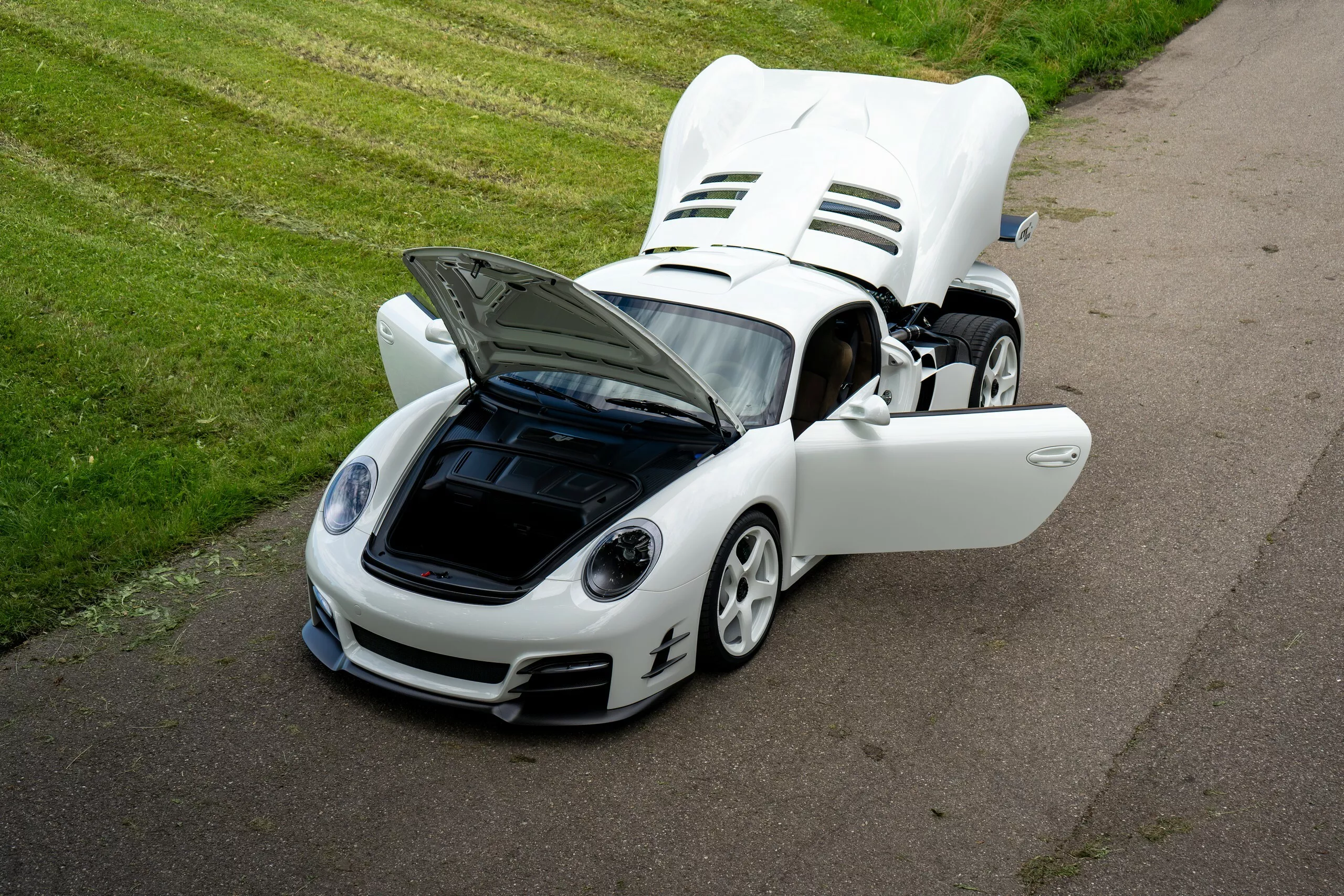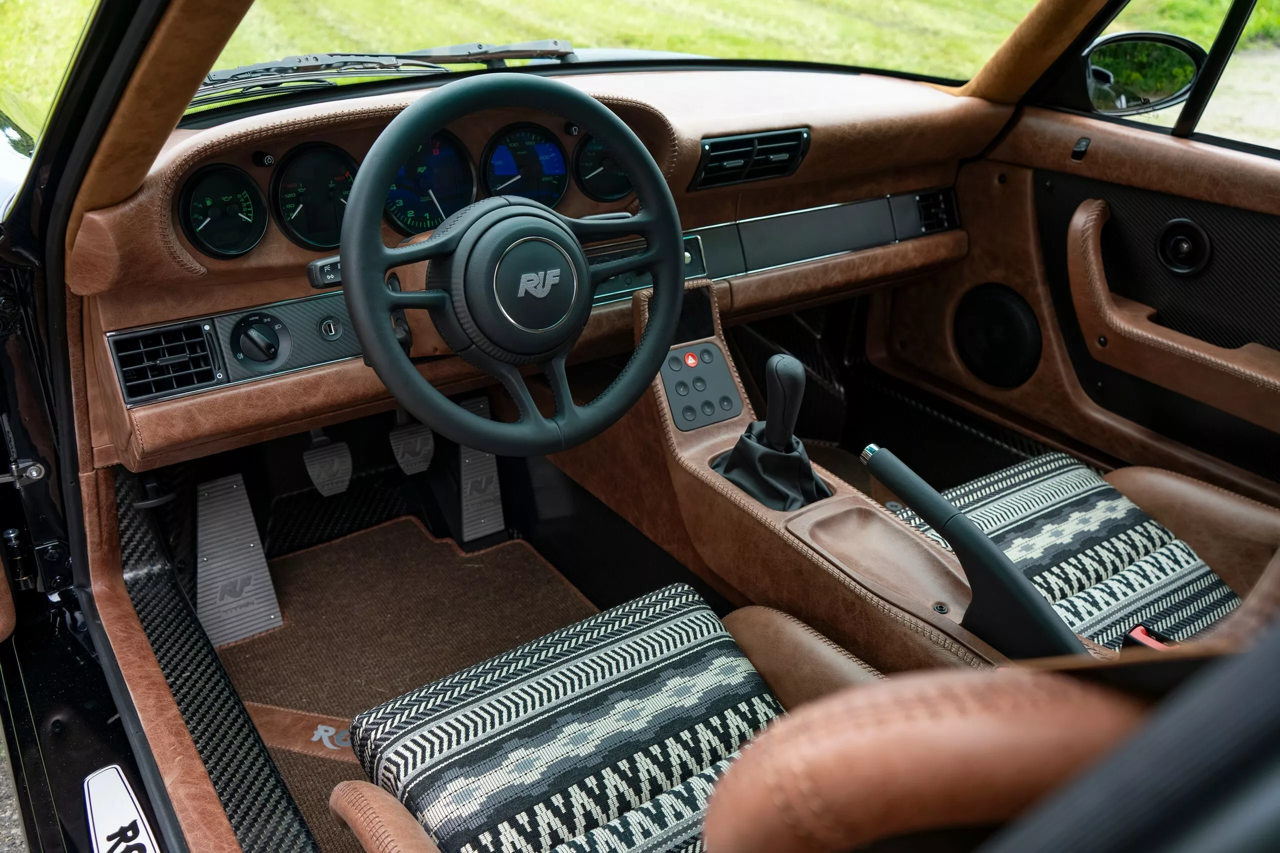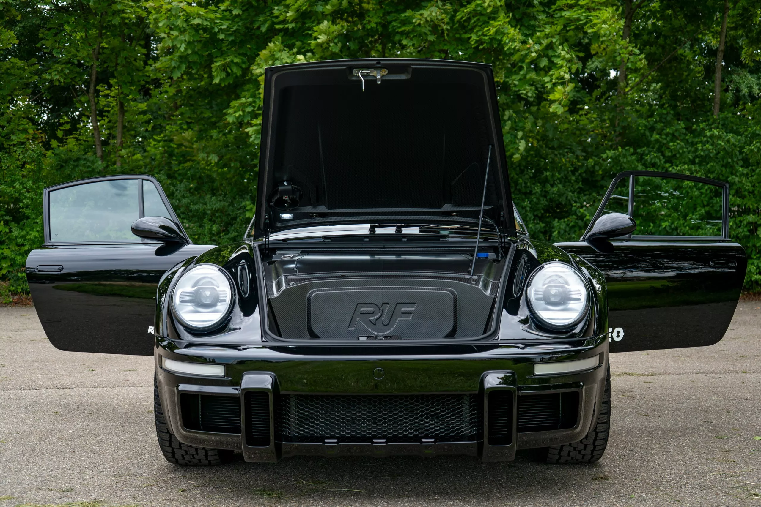 على عكس ما قد يظنه البعض بأنها مجرد بورشه معدلة، فإن Ruf Rodeo مبنية على هيكل أحادي من ألياف الكربون (Carbon Monocoque) بالكامل، ما يجعلها السيارة الوحيدة من نوعها الجاهزة للأوف-رود بهذه البنية. النسخة الأولى جاءت بلون Jordan Black مع جنوط بيضاء بمثبت مركزي (Centerlock) تمنحها مظهرًا هجوميًا لا يُخطئه النظر.