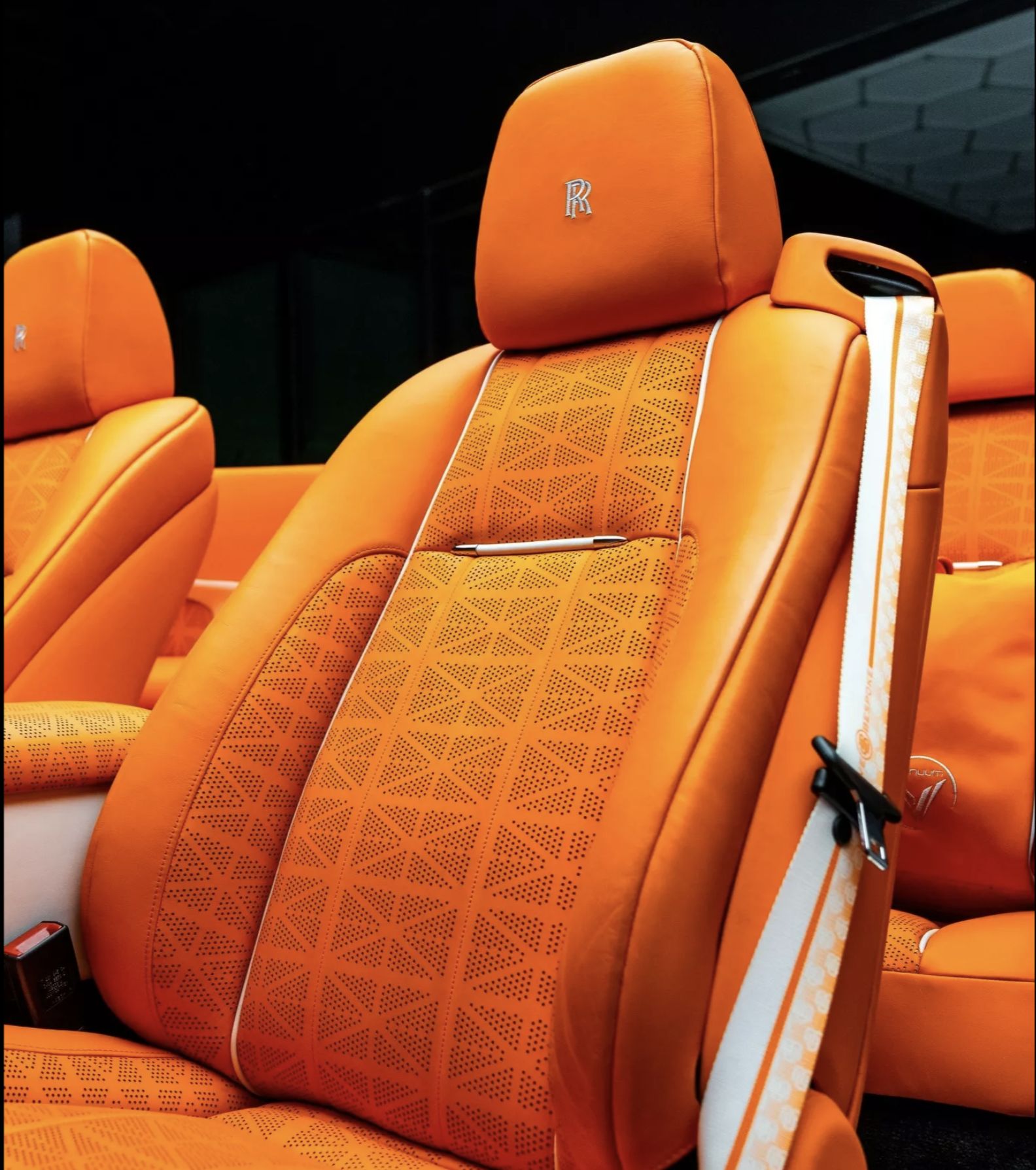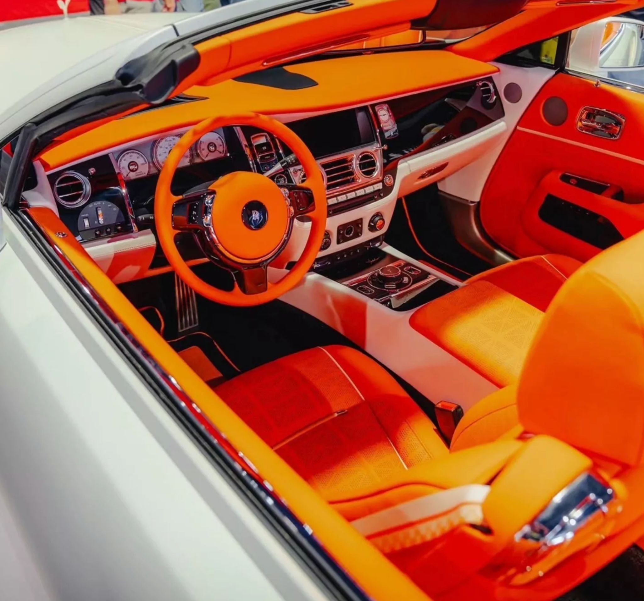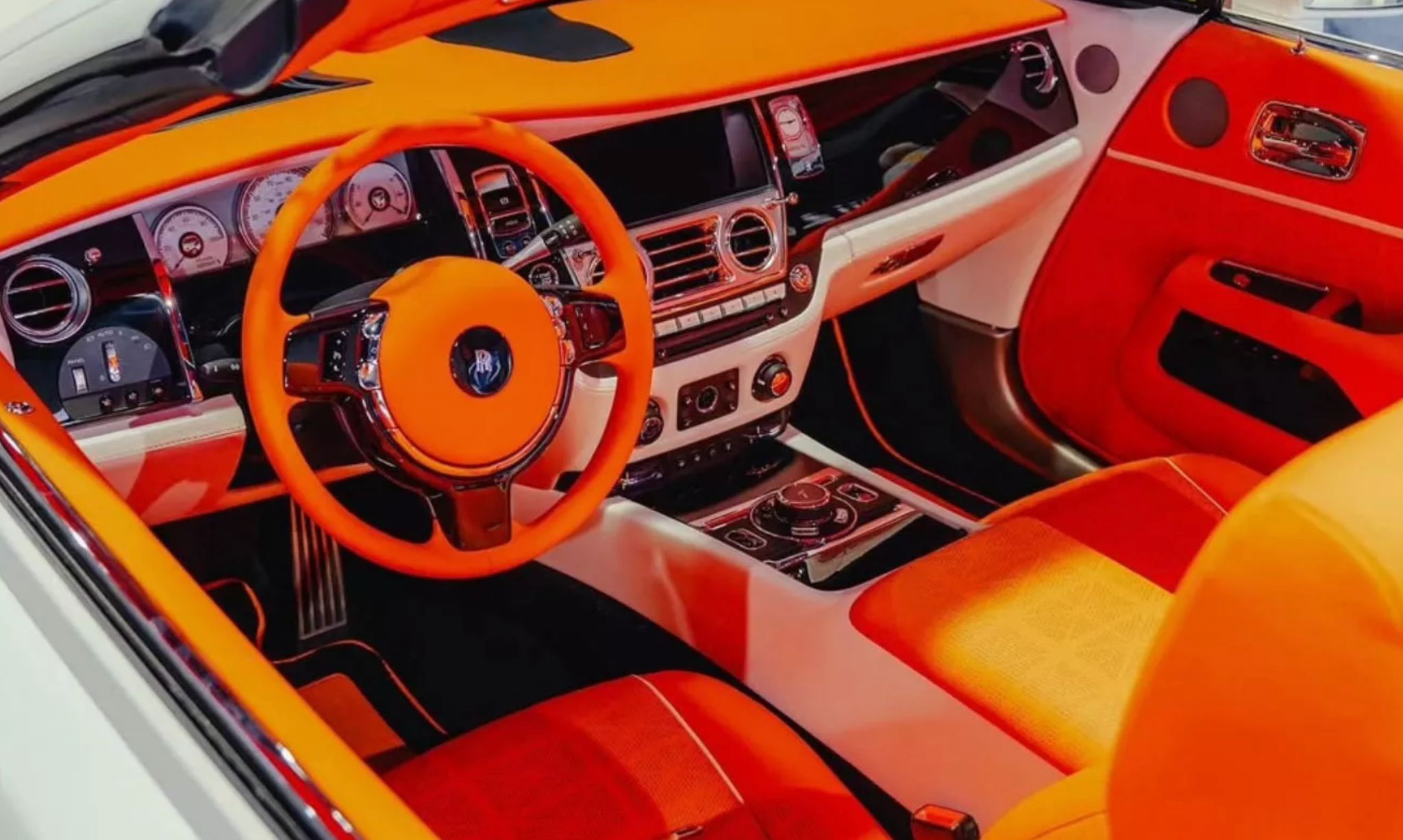 داخل المقصورة، تستمر لغة التباين والجرأة نفسها. الألوان الفاتحة، وعلى رأسها الأبيض، تمتزج مع لمسات لونية قوية، ما يخلق أجواء داخلية بعيدة تمامًا عن الفخامة الكلاسيكية المعتادة لدى رولز-رويس.