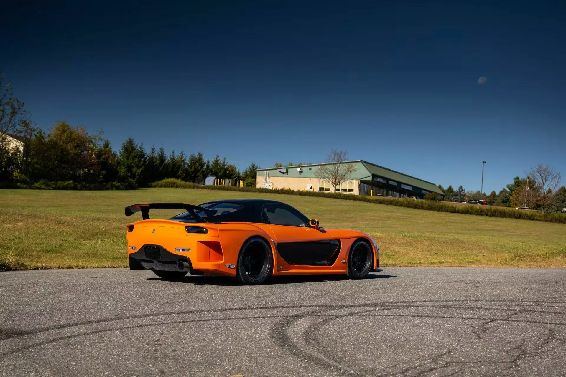 هذه النسخة مزودة بهيكل VeilSide Fortune الأصلي الذي يمنح RX-7 مظهراً قريباً من السيارات الأوروبية الخارقة. الطلاء البرتقالي والأسود يعيد أجواء الفيلم بدقة سينمائية، فيما تعتمد السيارة على نظام قيادة يسار لتكون أكثر ملاءمة للطرق الأمريكية.