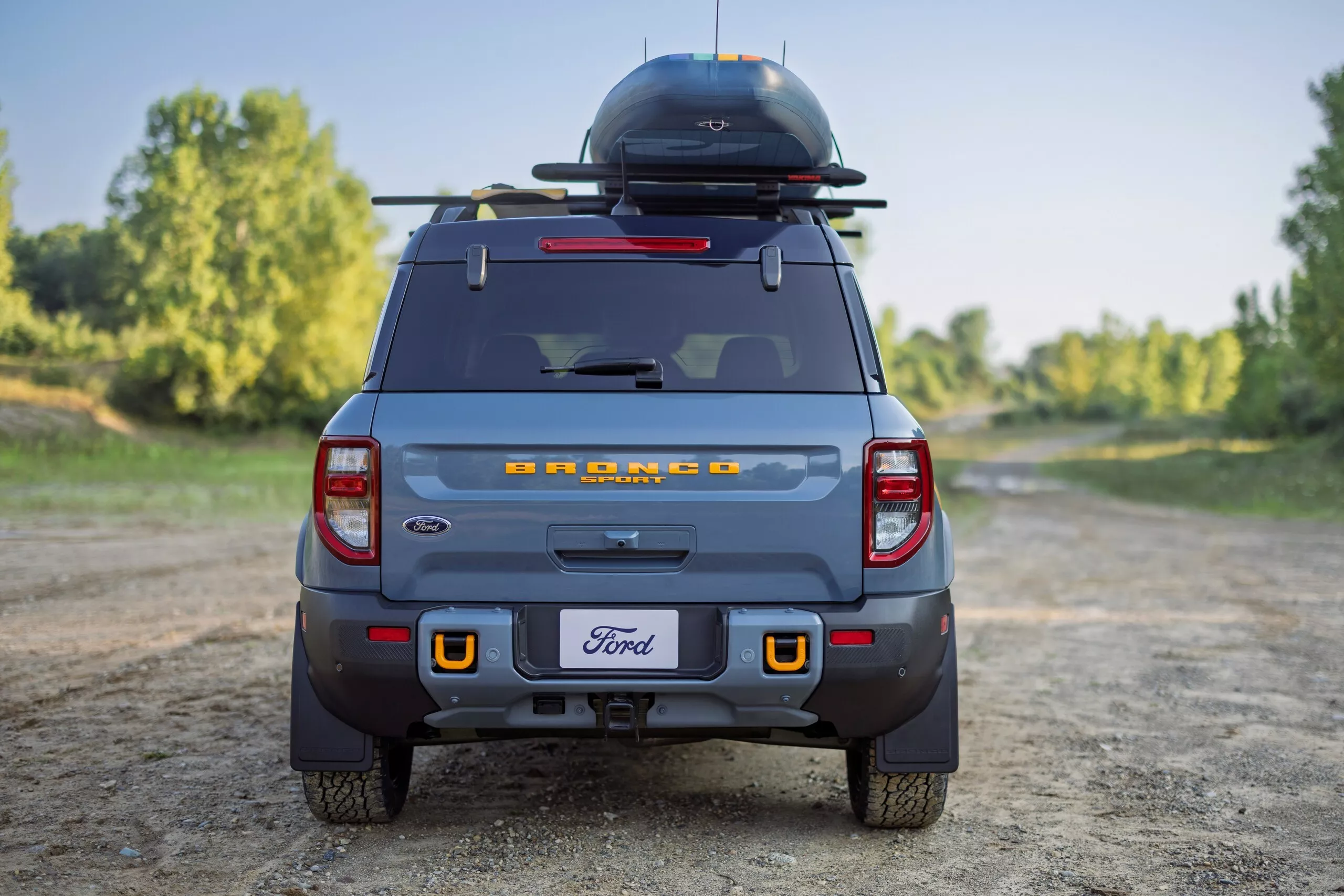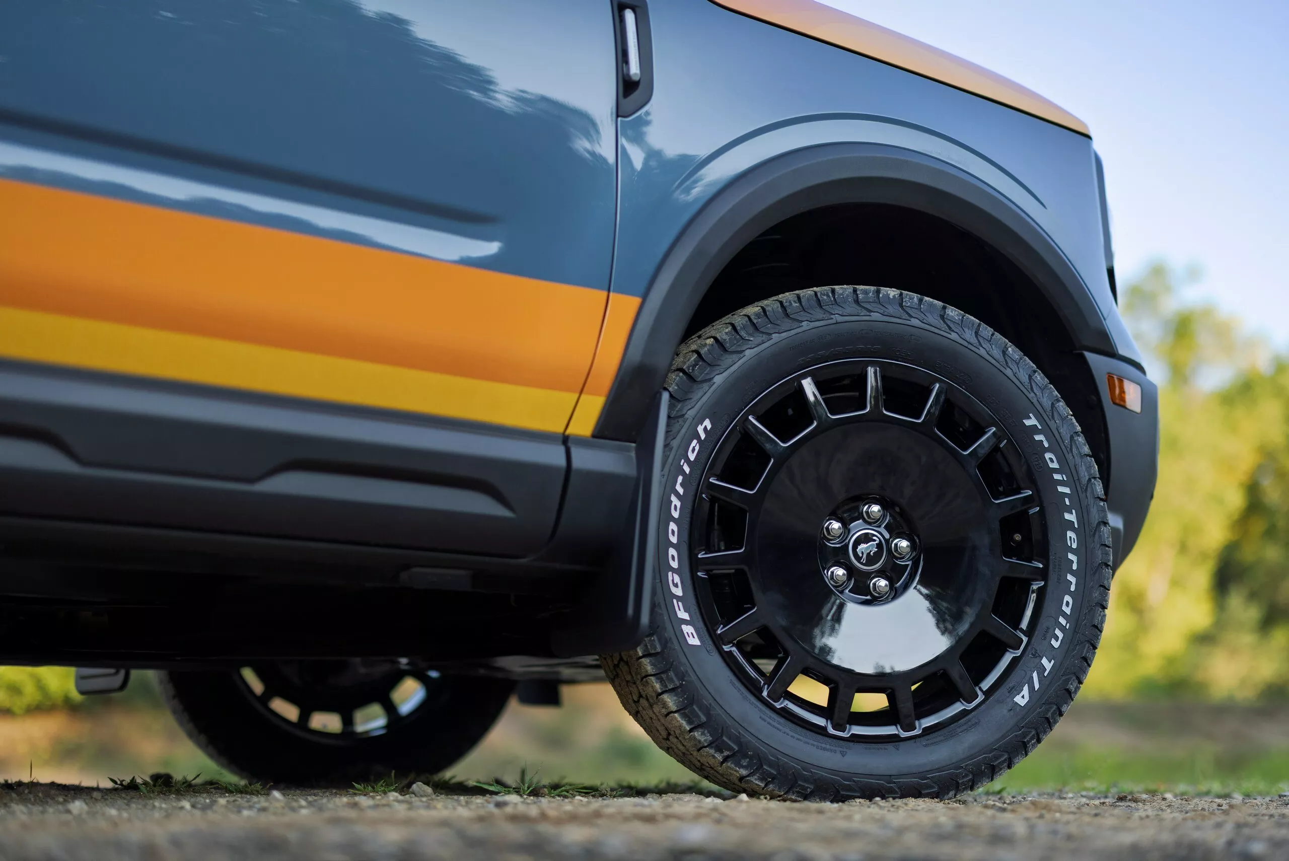 - Bronco Sport استعارت تصميم العجلات من Mustang Mach-E Rally مطلية باللون الأسود مع إطارات BFGoodrich XL.