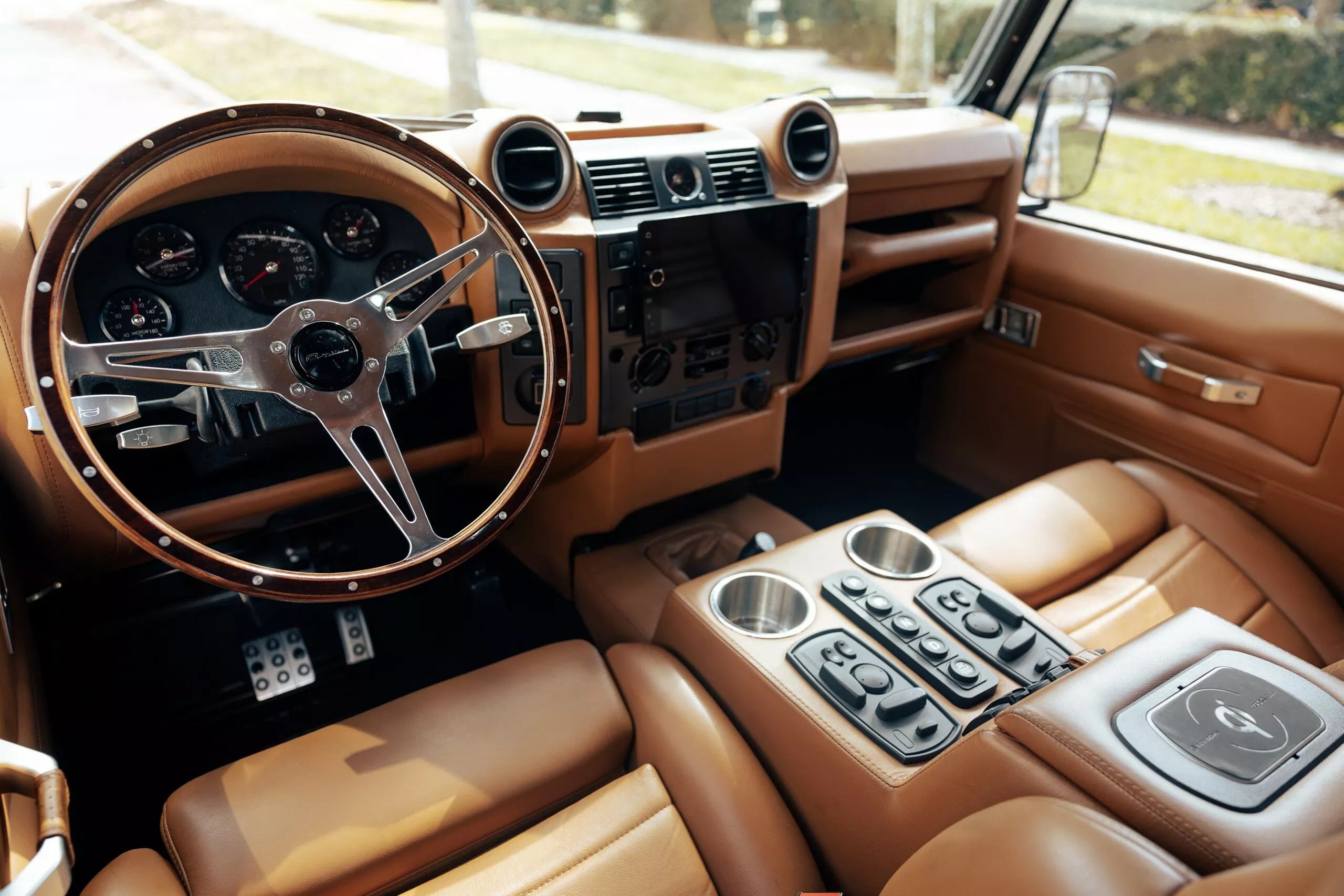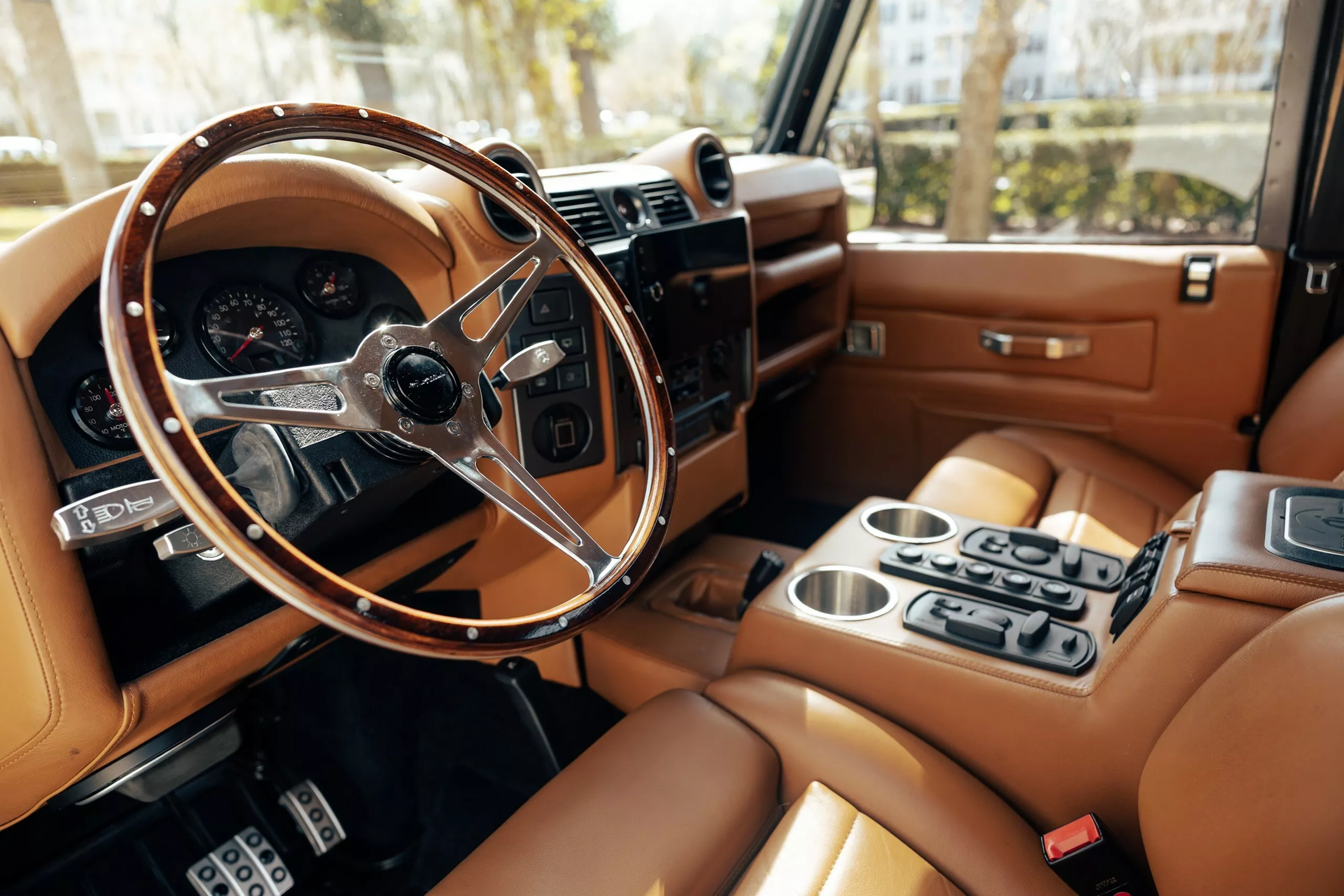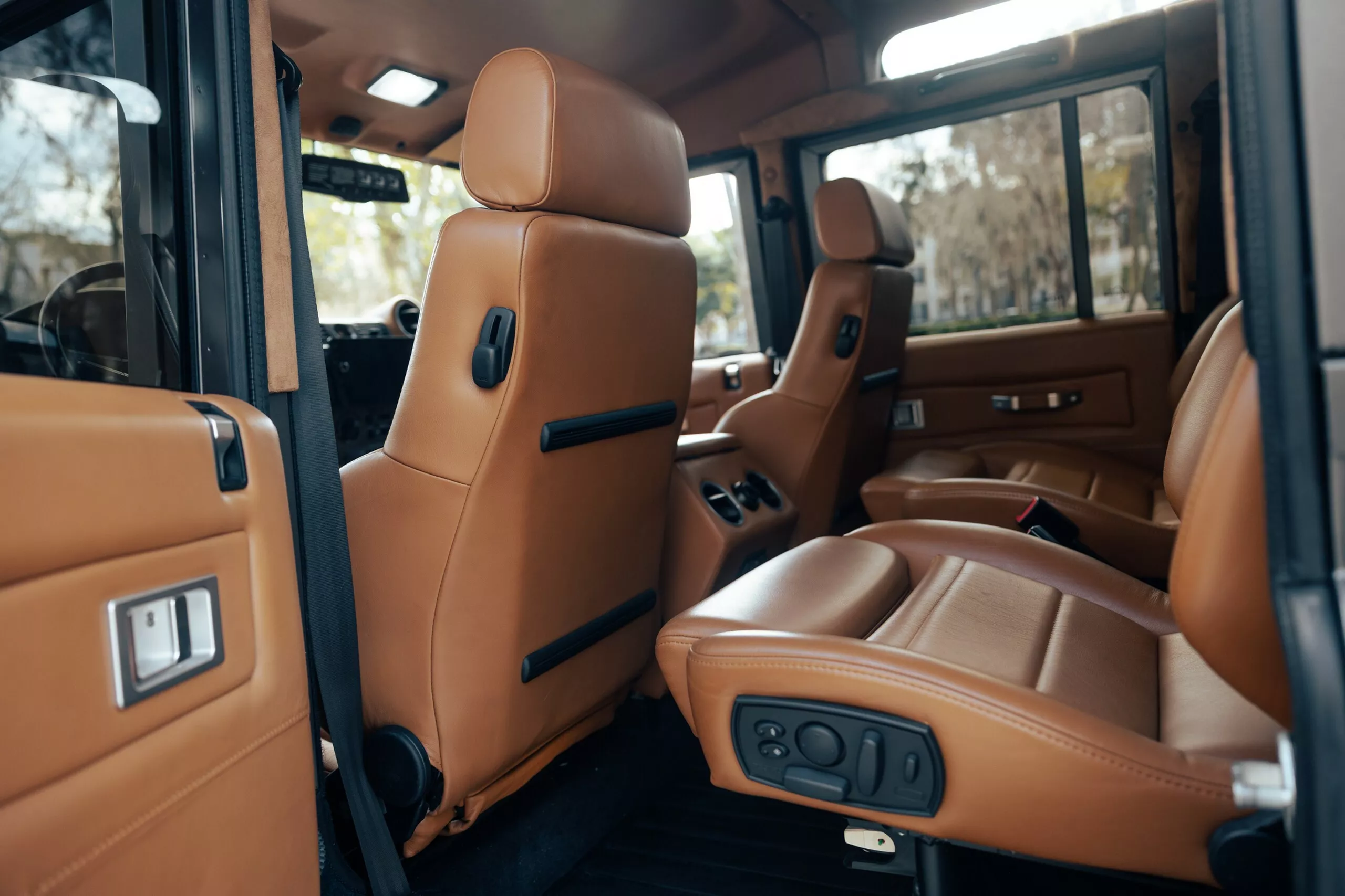 من الداخل، حصلت ديفندر الكهربائية على مقاعد رياضية Recaro Orthoped مكسوة بجلد Veluto Pelle، وعجلة قيادة Exmoor Evander، وعدادات مخصصة، ولمسات من الألومنيوم، بالإضافة إلى شاشة معلومات ترفيهية حديثة.