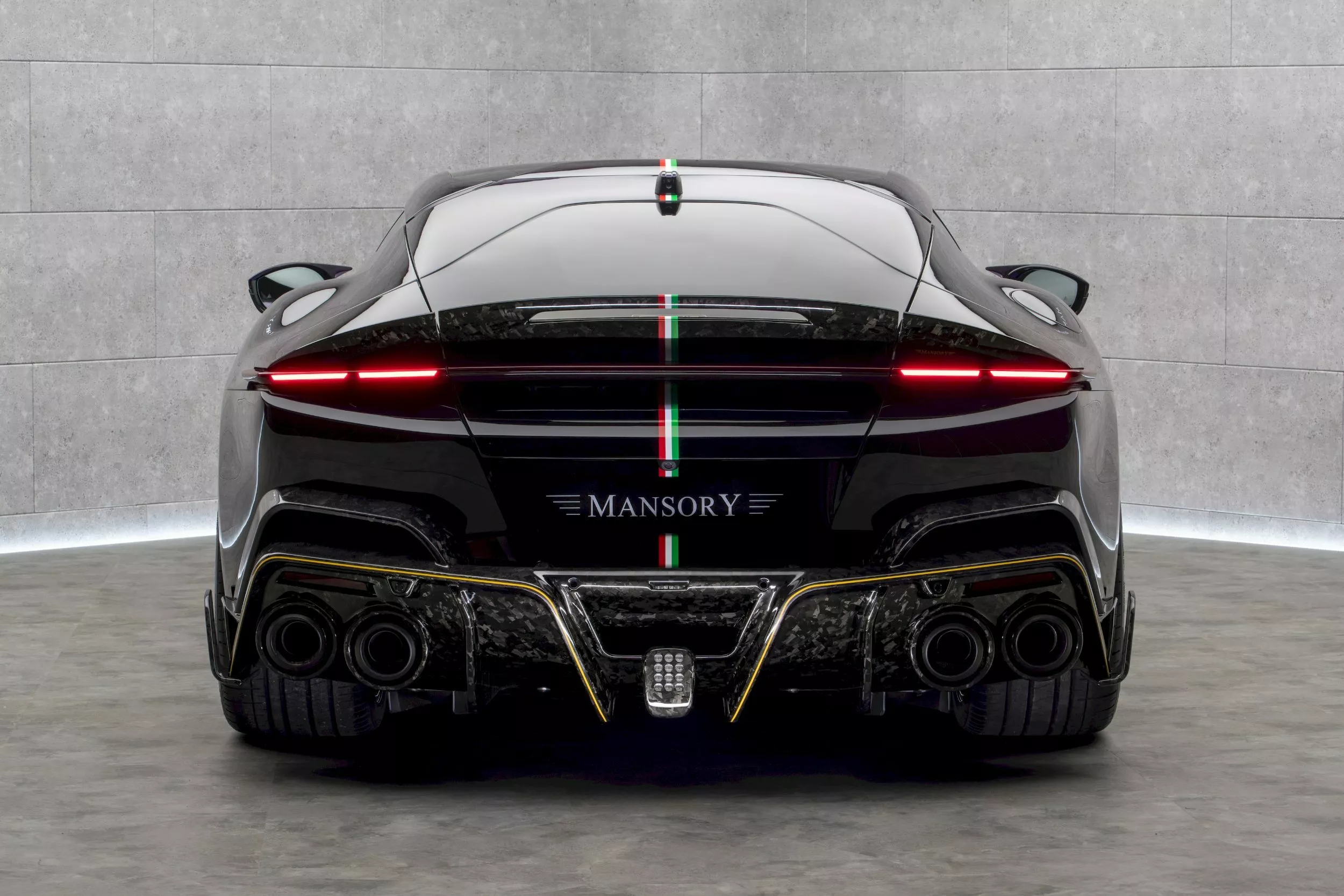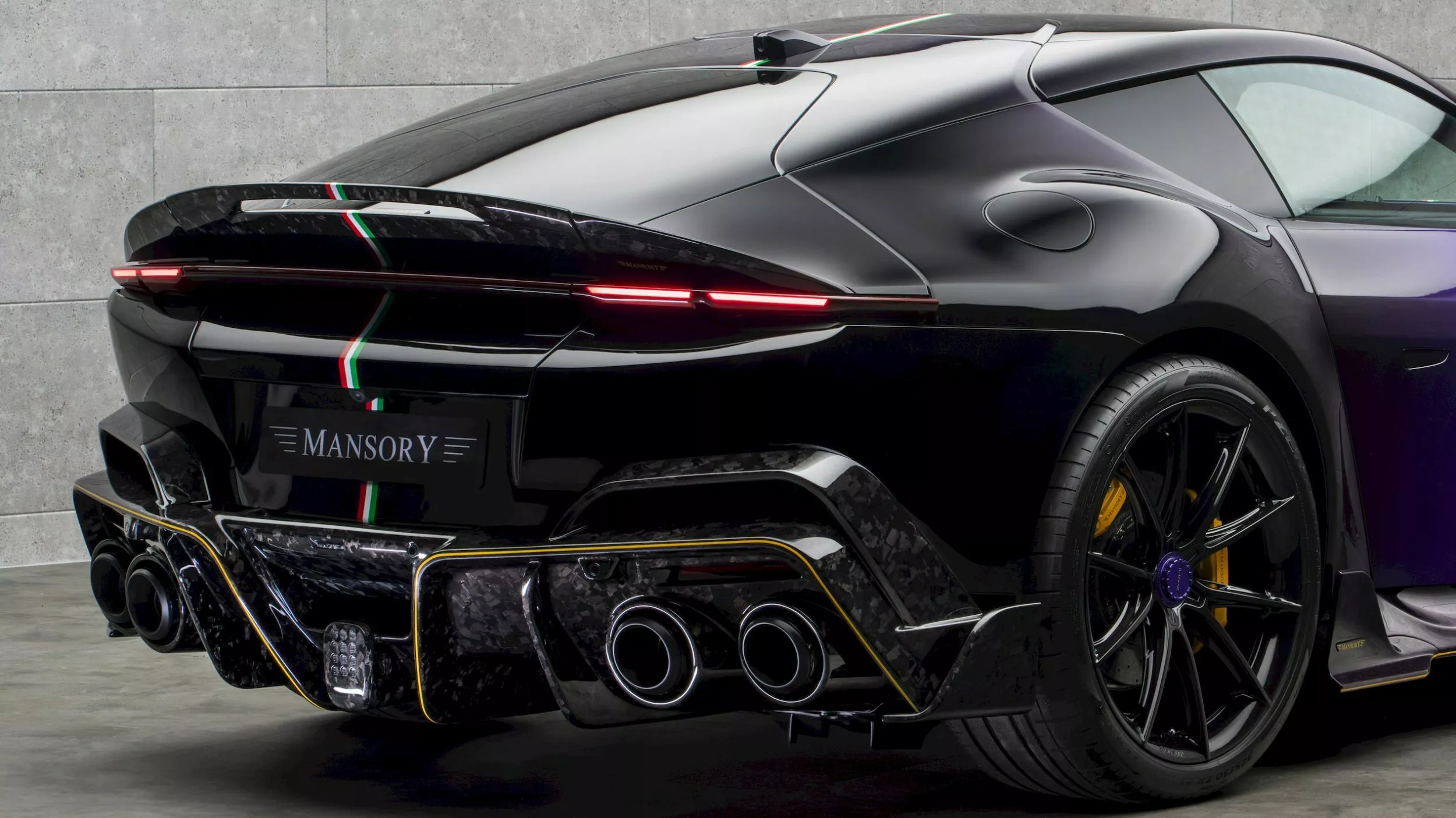 تخلّت مانسوري عن شعارات فيراري التقليدية لتقدم هيكلًا أكثر جرأة. حصلت السيارة على لمسات مكثفة من الكربون المزيف مع طلاء بنفسجي وأسود وإضافات ذهبية. المقدمة تضم شبكًا معاد التصميم وغطاء محرك مهوي وجناح سفلي بارز، بينما الجوانب جاءت مع مرايا وأعتاب جانبية جديدة ومآخذ هواء أوسع. في الخلف، نجد ناشر هواء ضخم من الكربون المكشوف مع أنابيب عادم رباعية ضخمة وأضواء LED نحيفة.