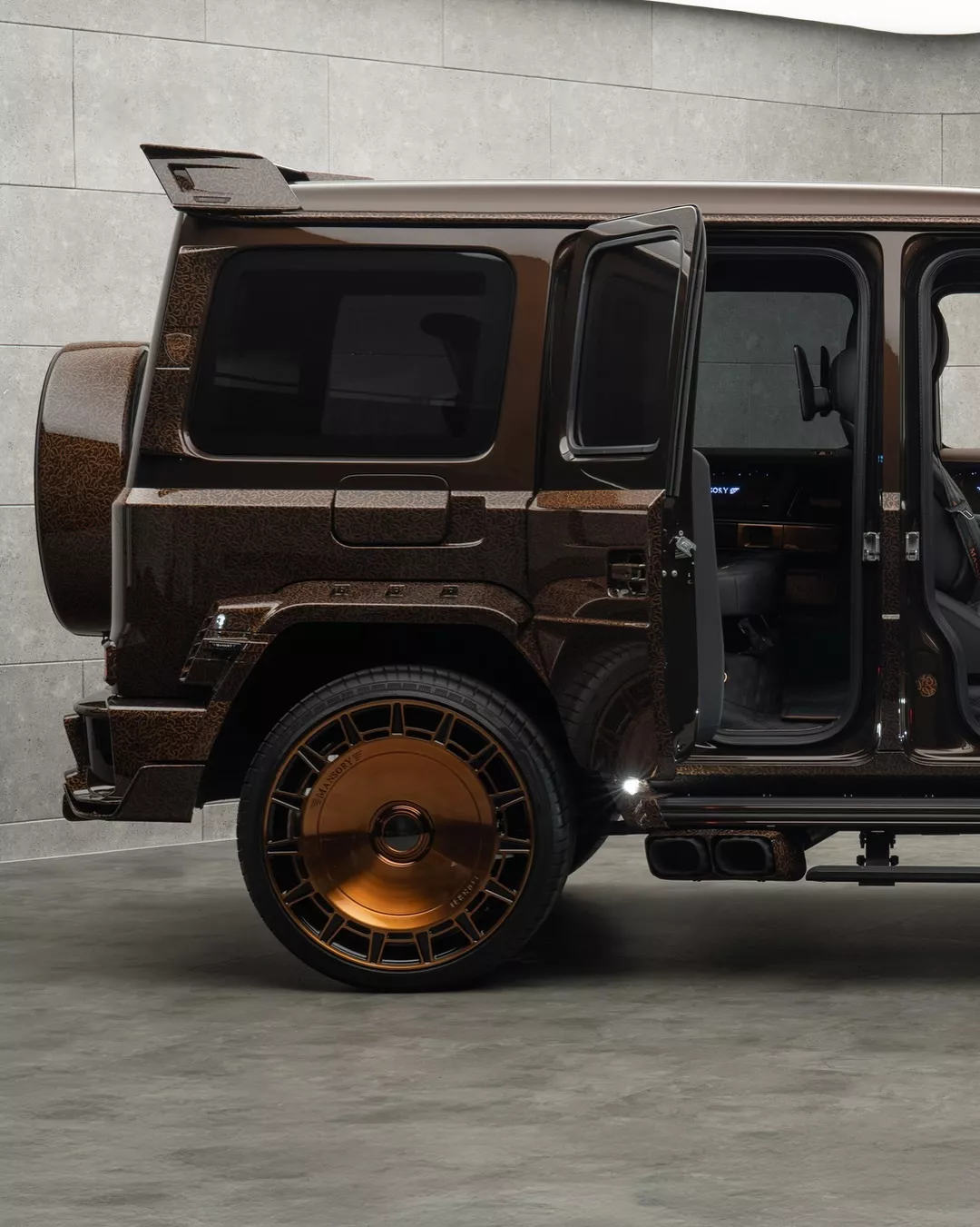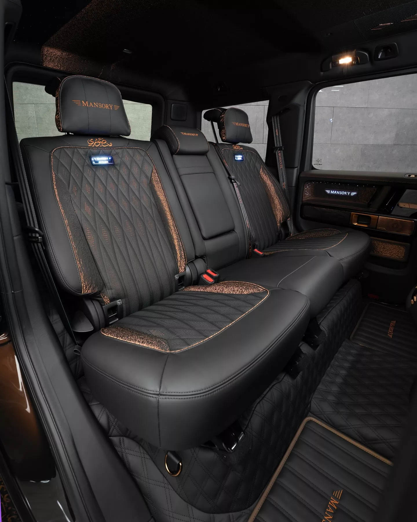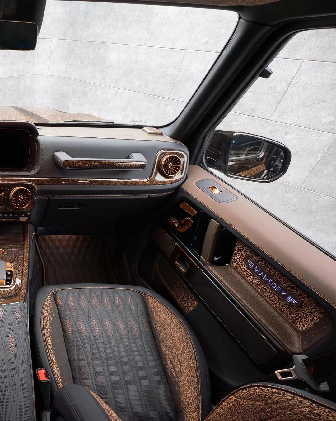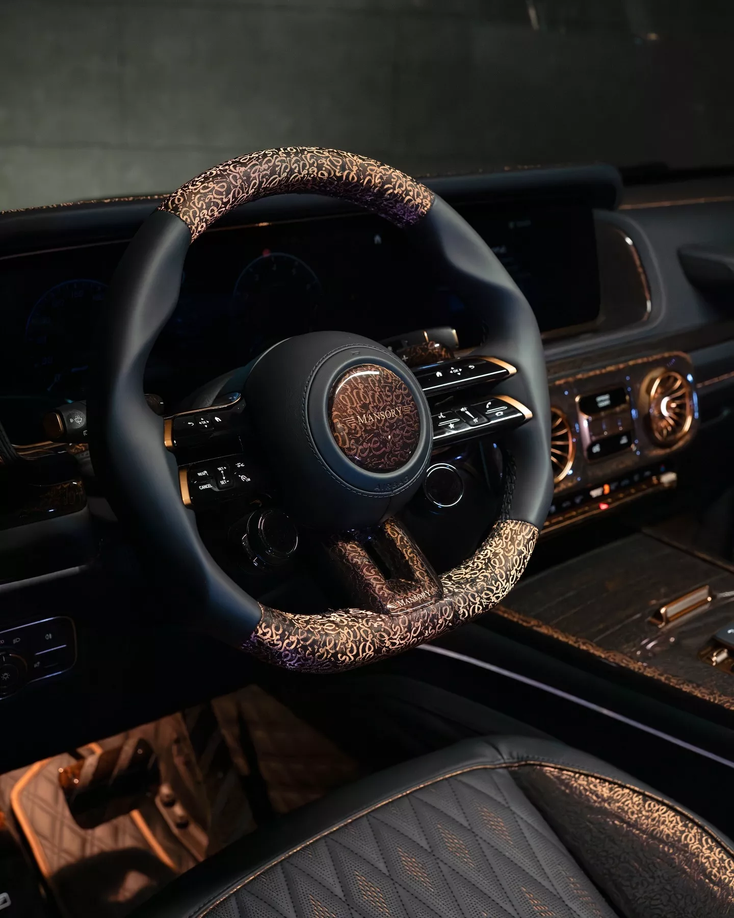 من الداخل، اكتست المقاعد والكونسول الوسطي والتابلوه بجلد أسود فاخر، بينما غطت الأبواب وأعلى لوحة القيادة بجلد بني مزخرف يتناغم مع النقوش الخارجية. التفاصيل اللامعة باللون البني تضيف طابعًا مبالغًا فيه يعكس فلسفة مانسوري.