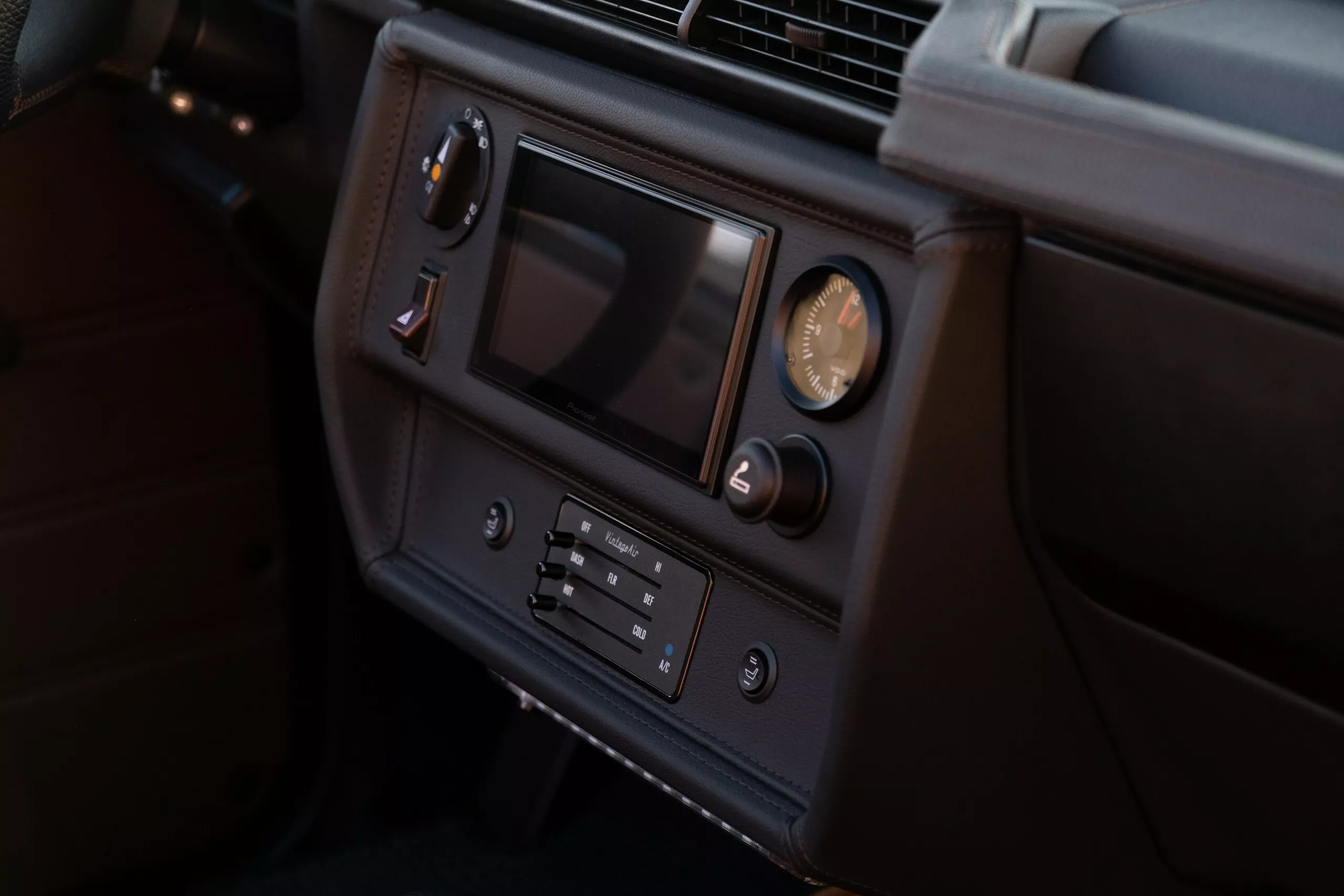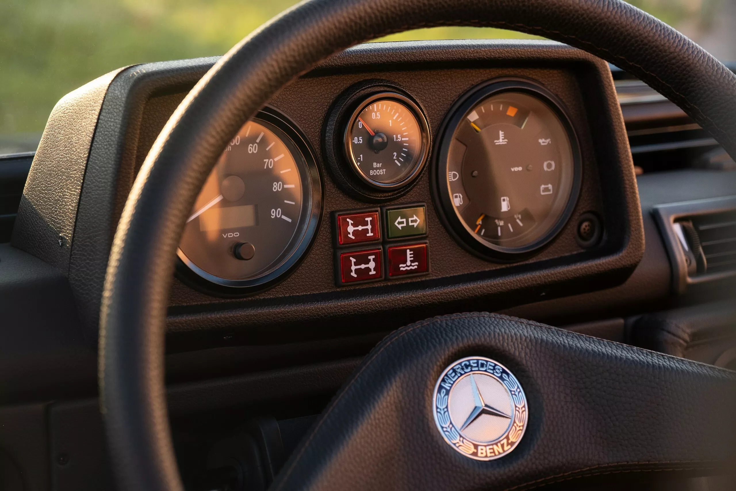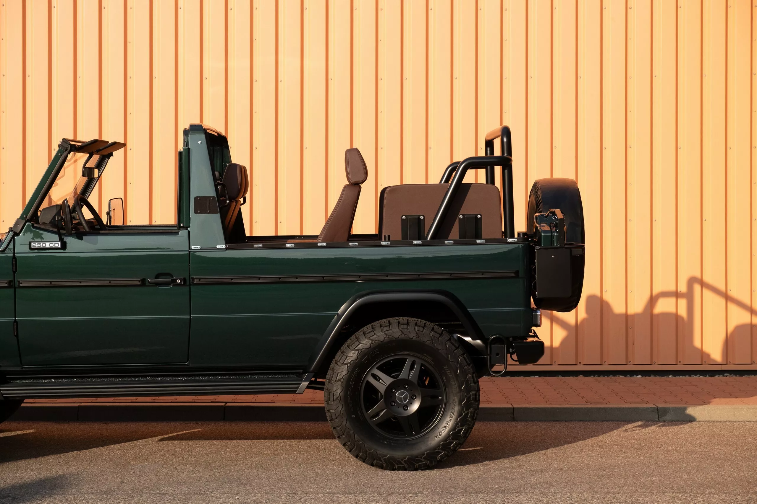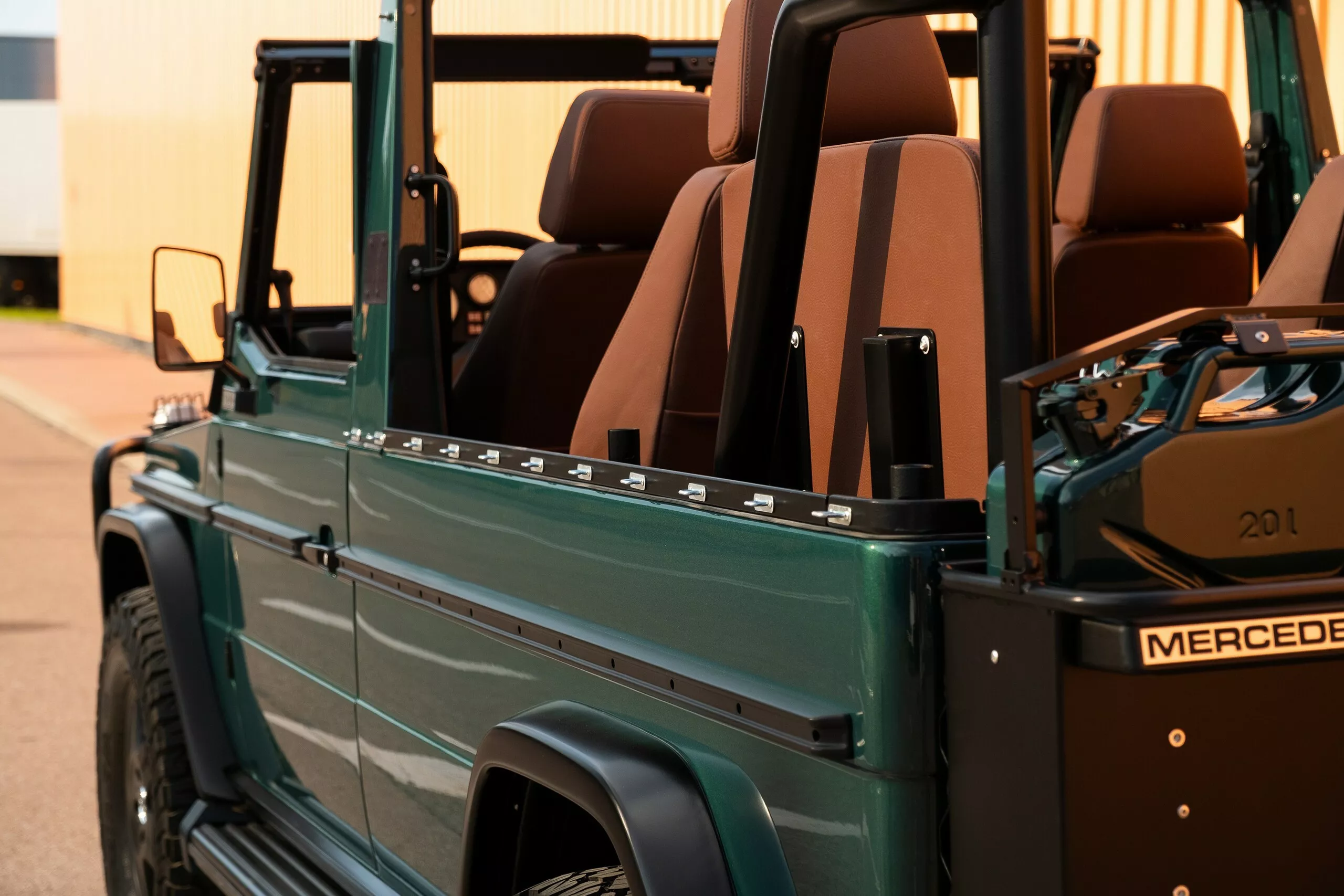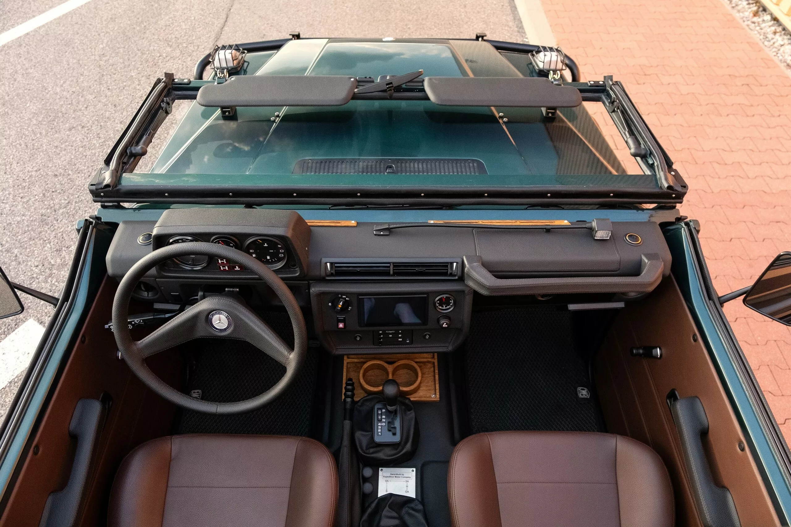 الداخلية تحتفظ بروح الـ G الكلاسيكية مع مقاعد جلدية بلون بني داكن وتصميم عملي فاخر، بينما يمكن طي الزجاج الأمامي بالكامل لتجربة قيادة مكشوفة نادرة في هذا النوع من السيارات.