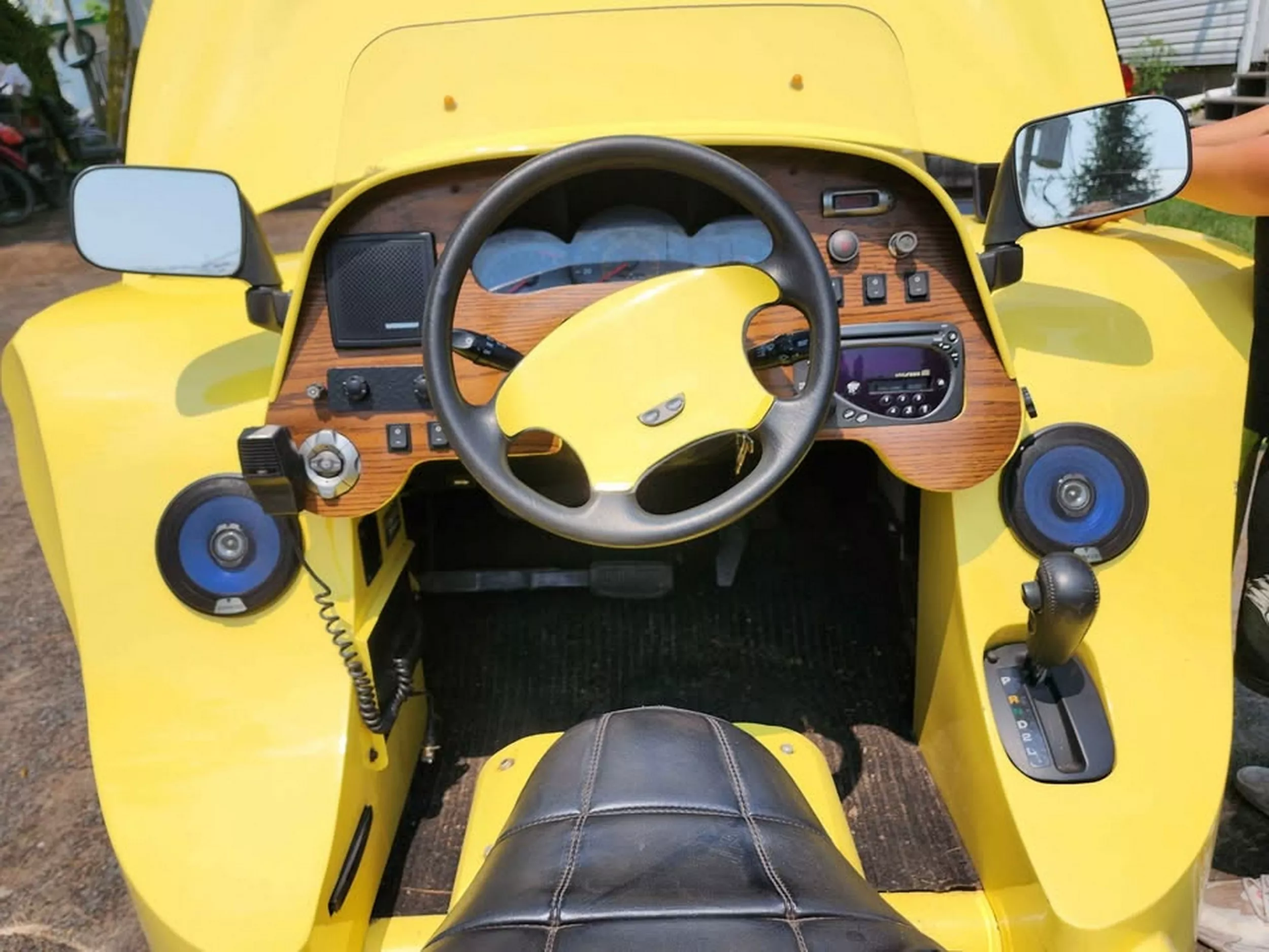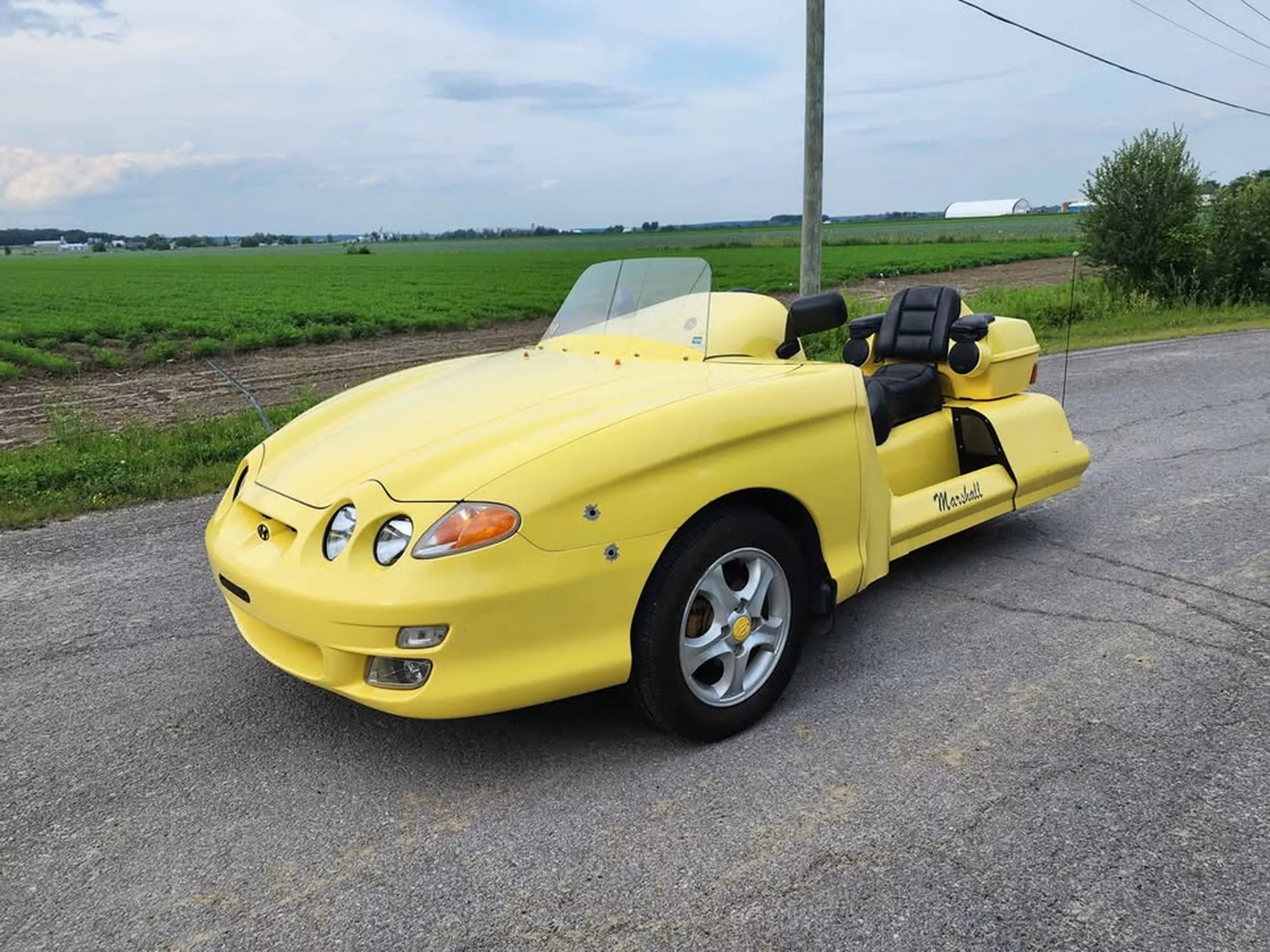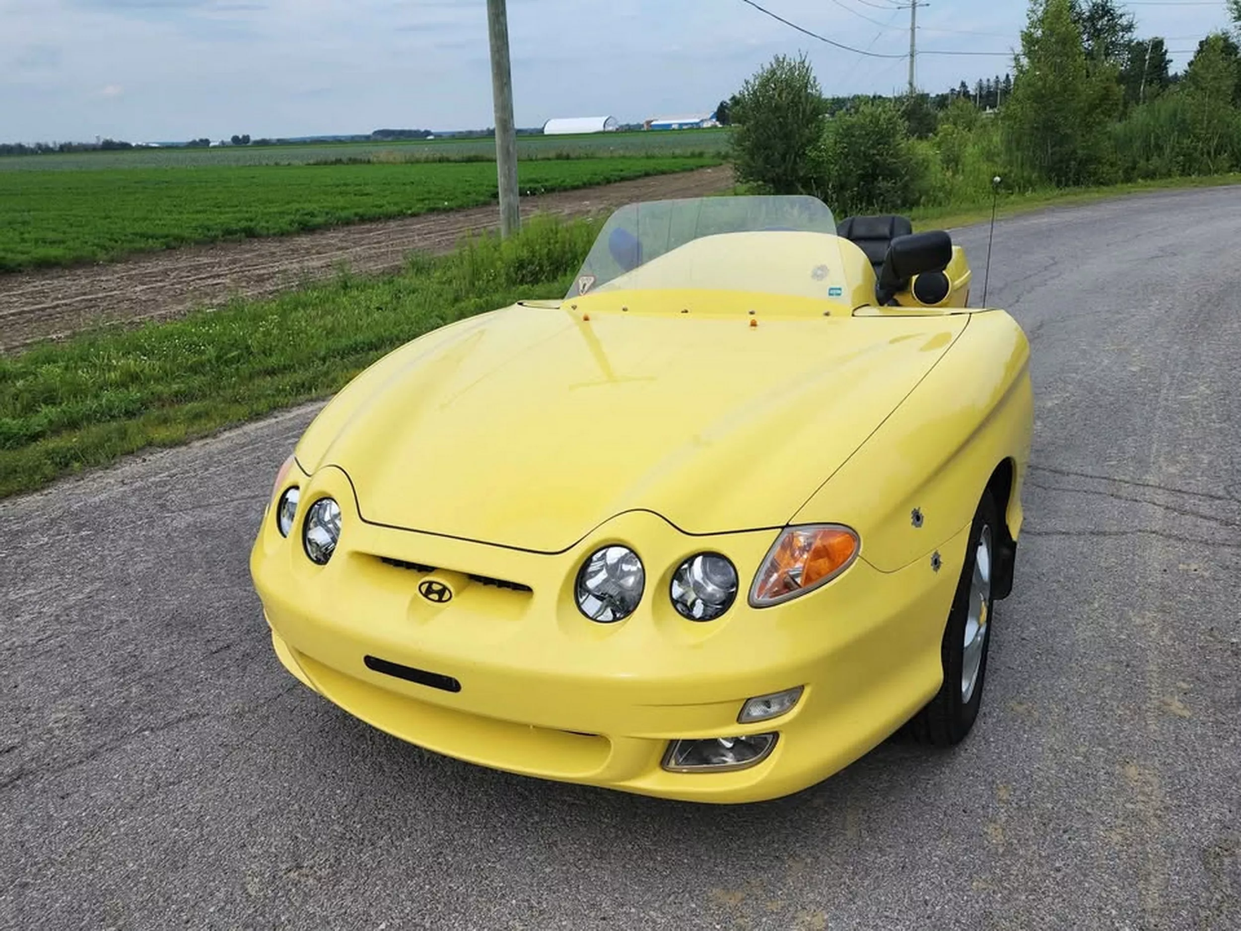 في المقدمة، تبدو المركبة كأنها سيارة هيونداي تيبورون تقليدية موديل 2001 بلون أصفر لافت. لكن المفاجأة تكمن في الخلف؛ حيث تم إزالة الجسم الخلفي بالكامل واستبداله بجزء مأخوذ من دراجة هوندا Goldwing، مُثبّتة على هيكل أنبوبي مُعزّز صُمم خصيصًا لهذا الغرض.