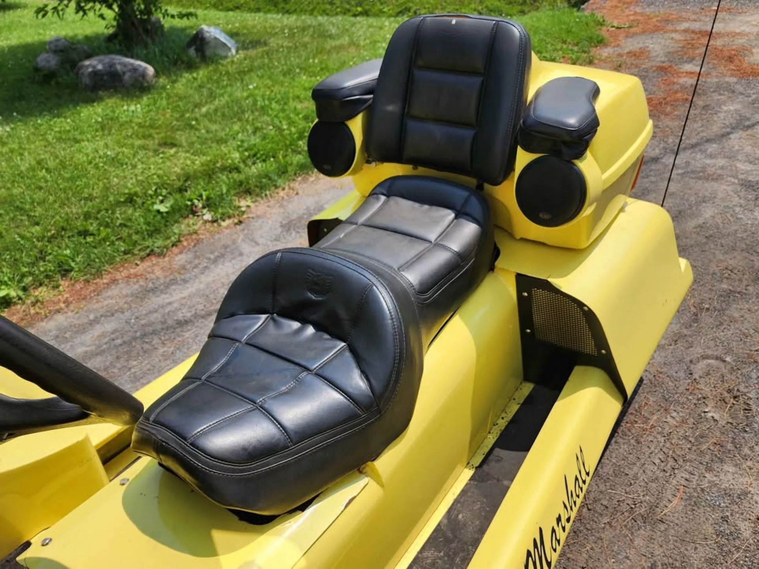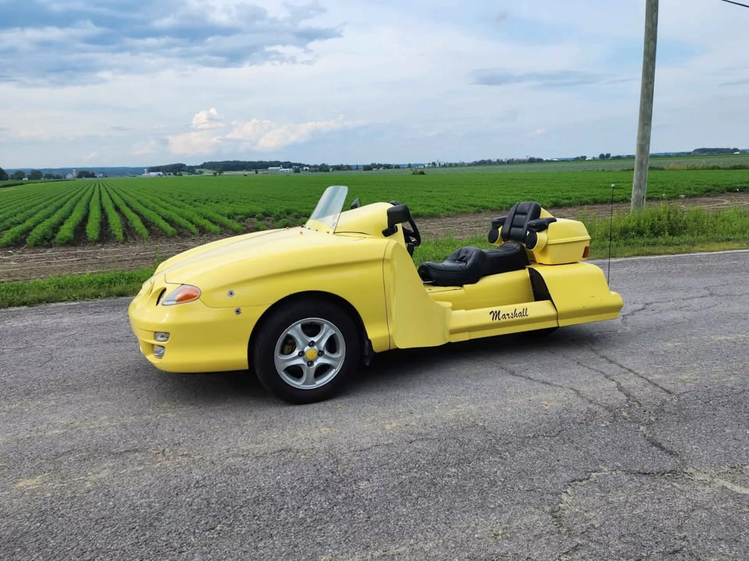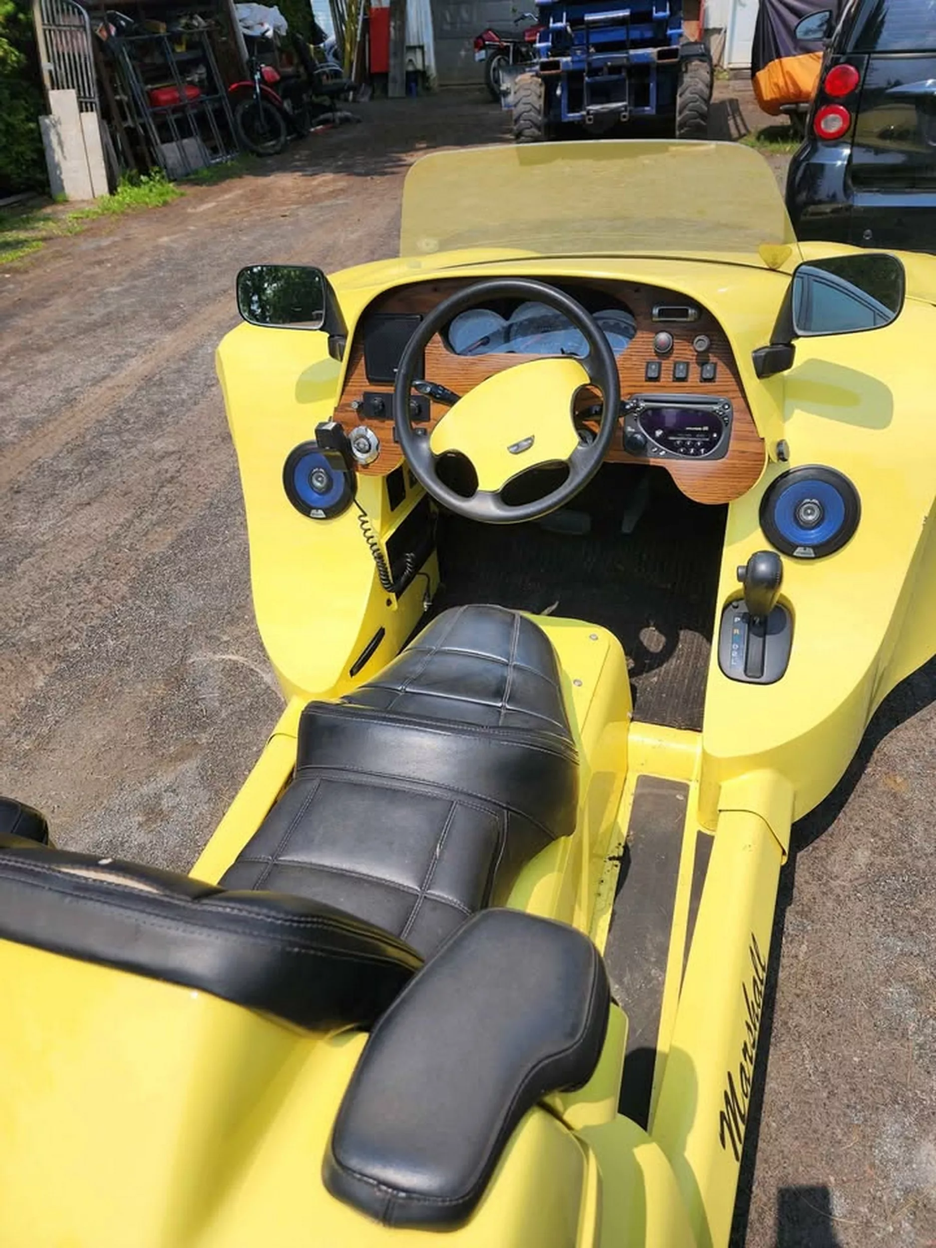 في المقدمة، تبدو المركبة كأنها سيارة هيونداي تيبورون تقليدية موديل 2001 بلون أصفر لافت. لكن المفاجأة تكمن في الخلف؛ حيث تم إزالة الجسم الخلفي بالكامل واستبداله بجزء مأخوذ من دراجة هوندا Goldwing، مُثبّتة على هيكل أنبوبي مُعزّز صُمم خصيصًا لهذا الغرض.