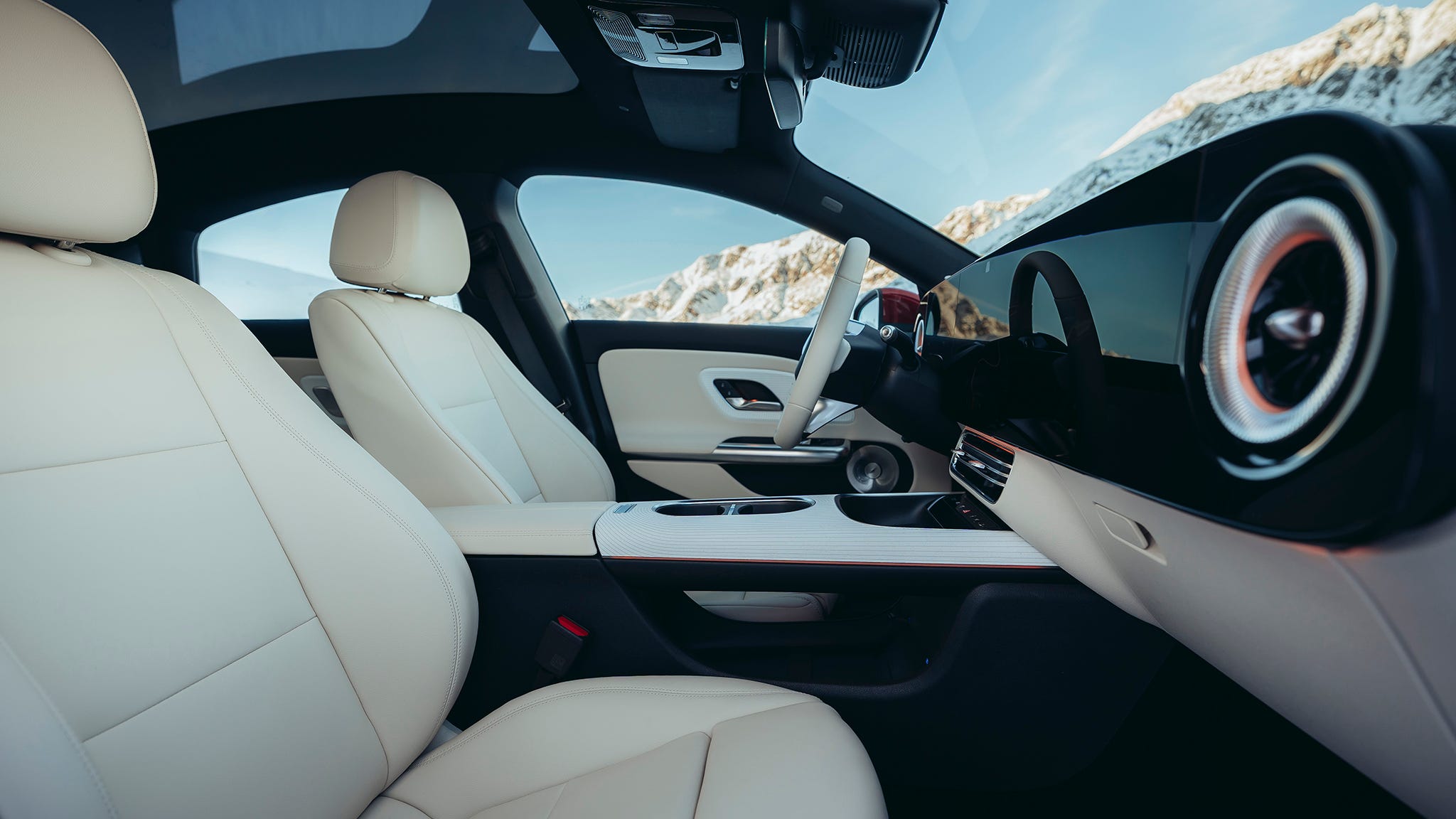 المقصورة تحتوي على شاشة عدادات رقمية 10.3 بوصة، وشاشة مركزية 14 بوصة كما يمكن اختيار شاشة إضافية للراكب الأمامي بنفس الحجم. النظام الفرعي يدعم مساعد رقمي ذكي من مرسيدس مستند على سحابة، وتطبيقات مثل الخرائط والملاحة، وصوتي Dolby Atmos ما يقدم تجربة ترفيهية وراحة راقية حتى في سيارة فئة دخول الماركة.