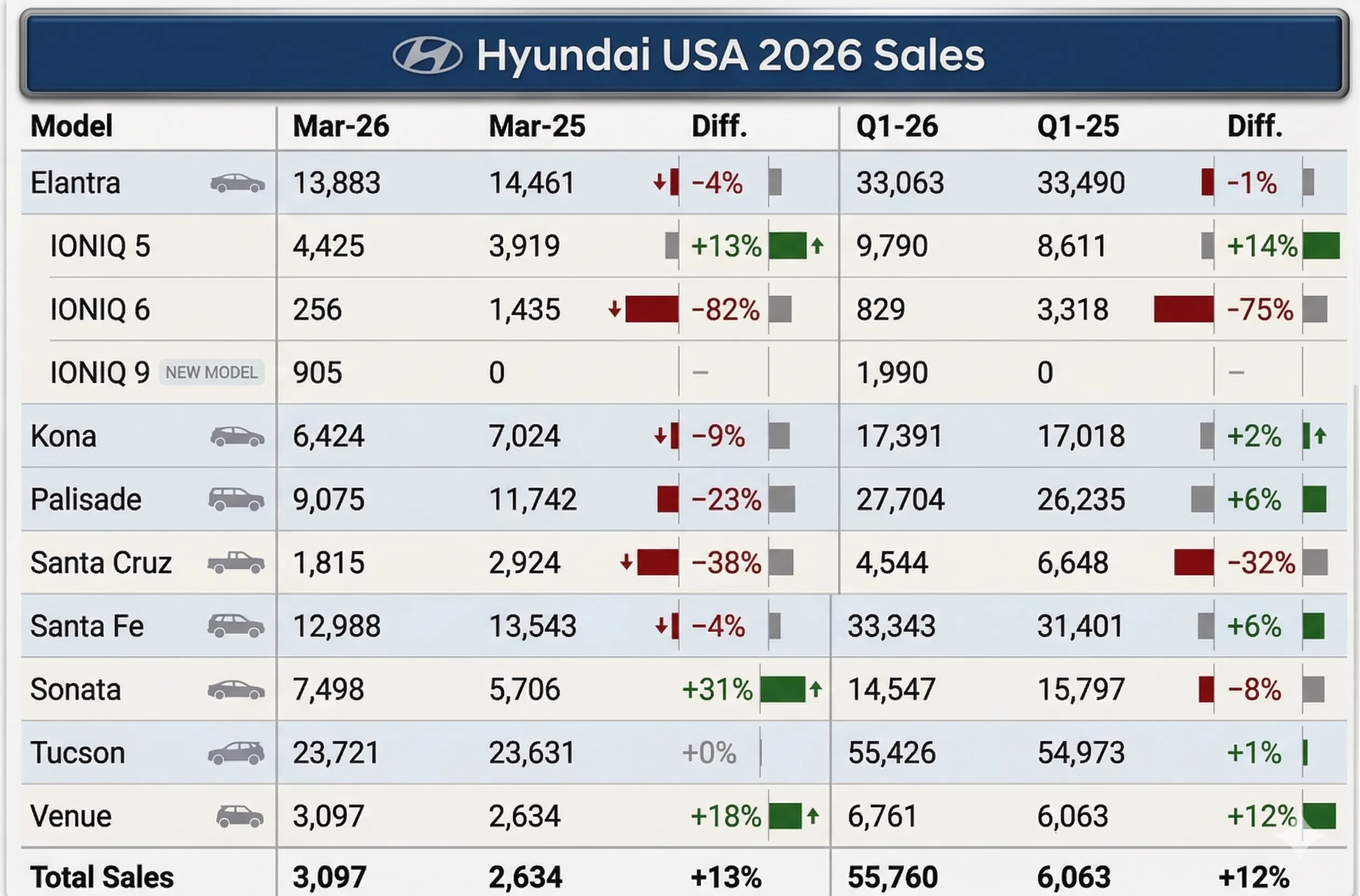 سجلت Hyundai نتائج إيجابية في مبيعاتها داخل الولايات المتحدة خلال الربع الأول من عام 2026، في مؤشر يعكس استمرار الطلب على طرازاتها، خصوصًا ضمن فئة السيارات الكهربائية والهجينة.